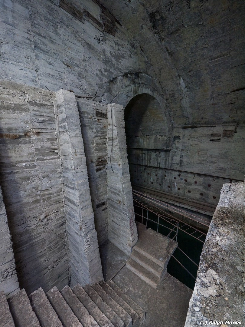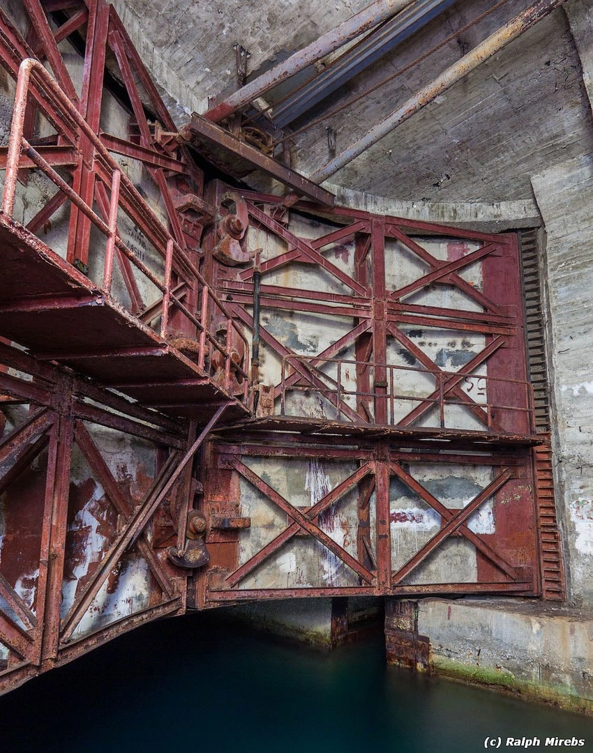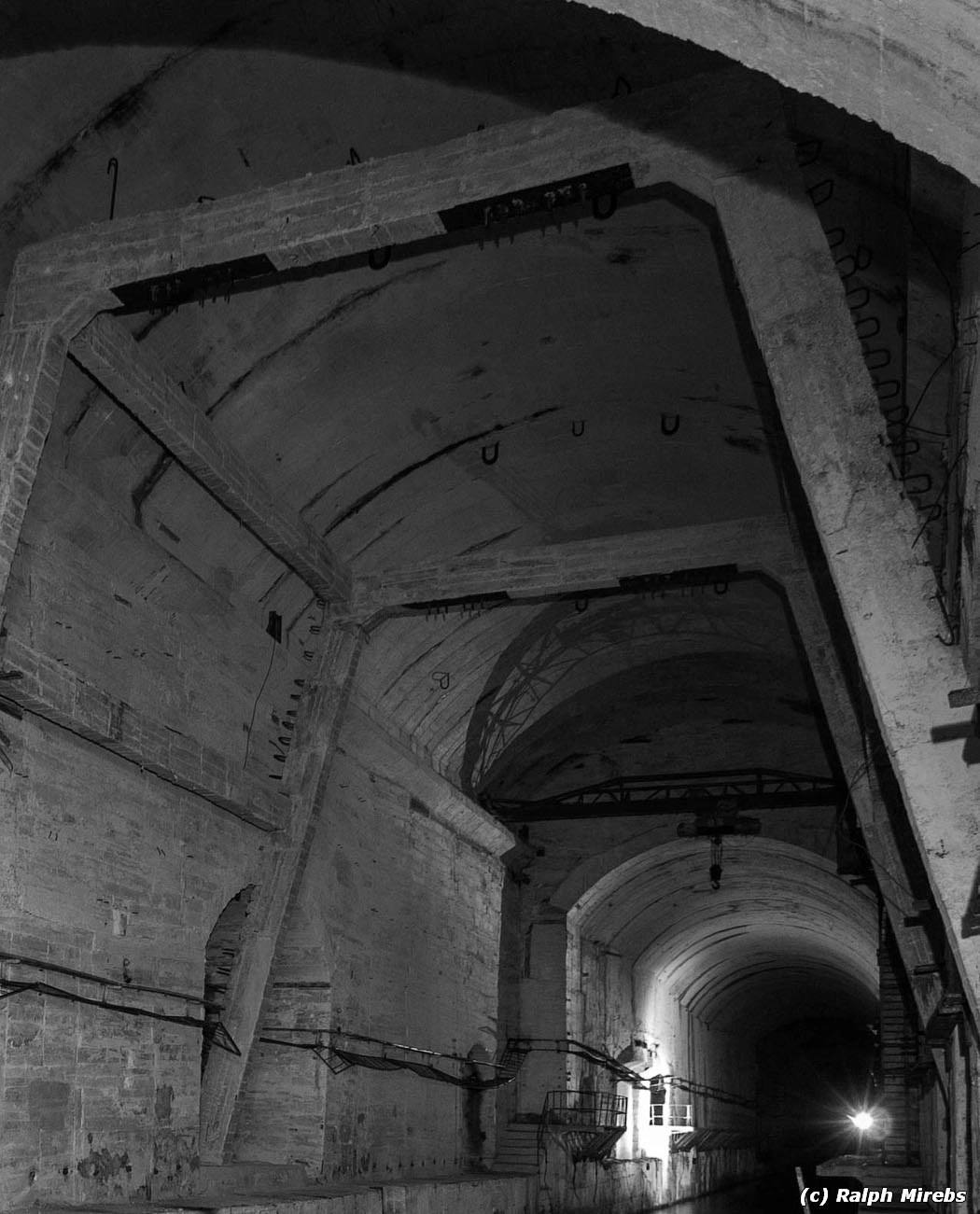 Кроме крана внутри смонтирована железобетонная трапеция для проведения погрузочно-разгузочных работ инесколько неглубоких боковых ниш, в которые уходят её «ноги». Железобетонная конструкция не упирается в свод канала, между ними есть небольшой промежуток. Поэтому эта конструкция не опора для усиления свода. В верхней части трапеции из бетона выступают закладные для монтирования перегрузочных устройств. Возможно, что тут планировалась установка полиспастов для подъёма катеров из воды для обслуживания винтов и днища. Самое красивое место в сооружении, по моему мнению.