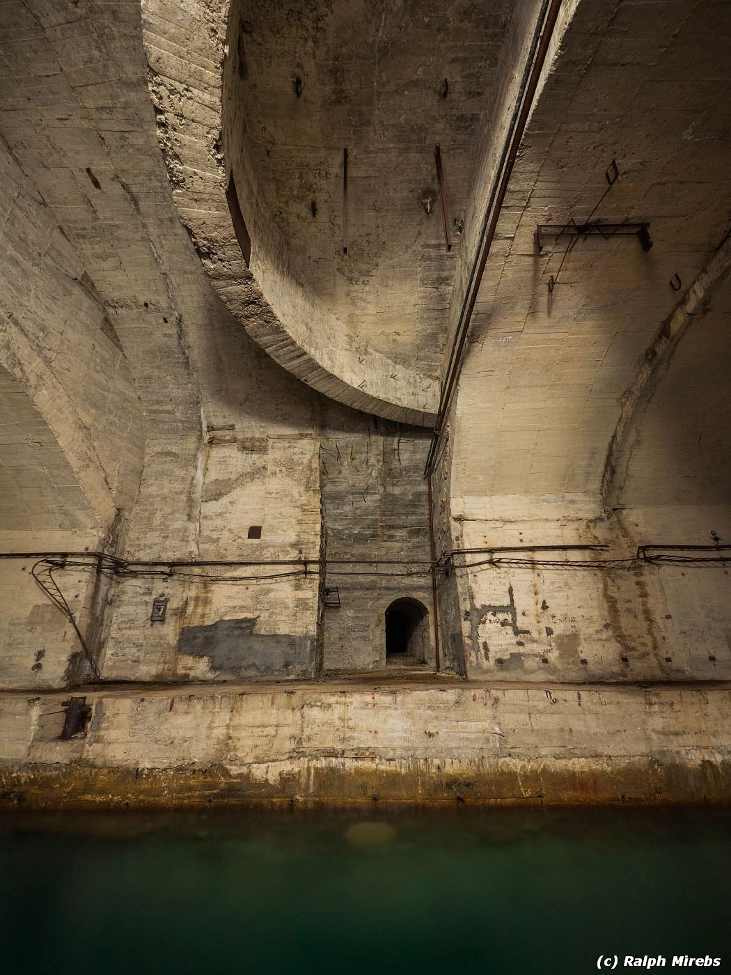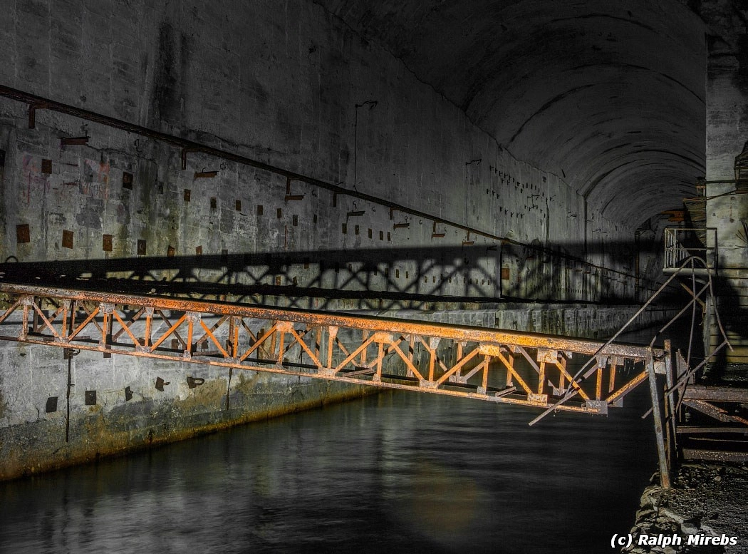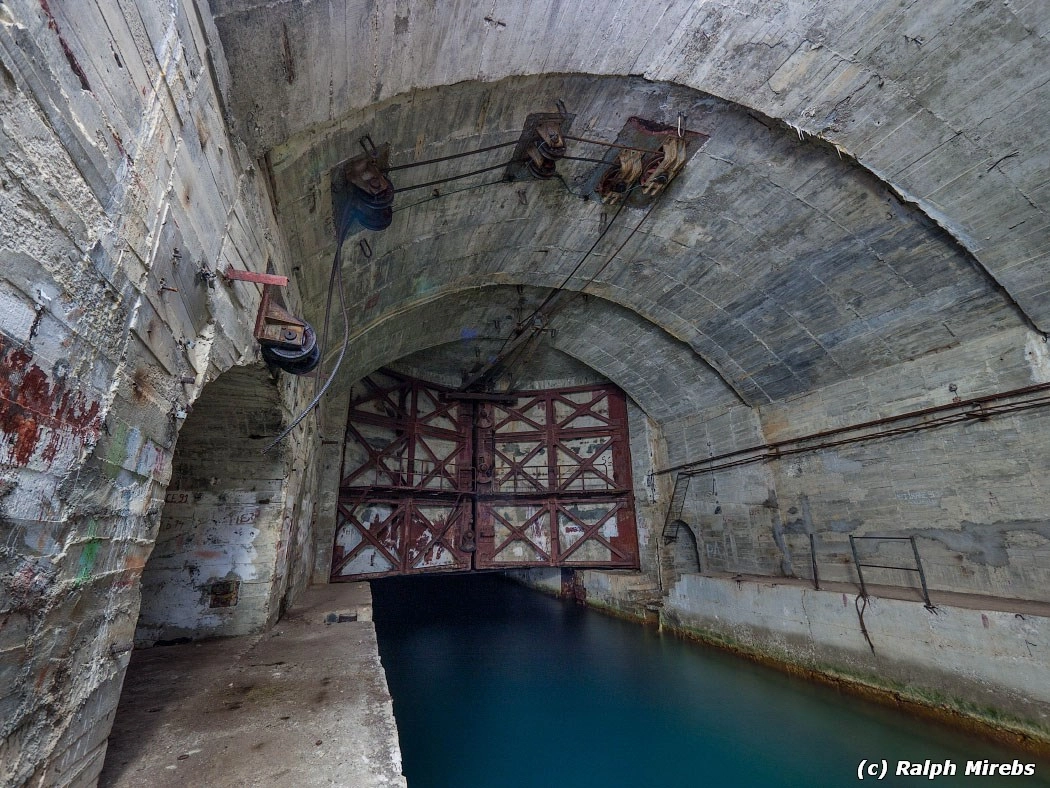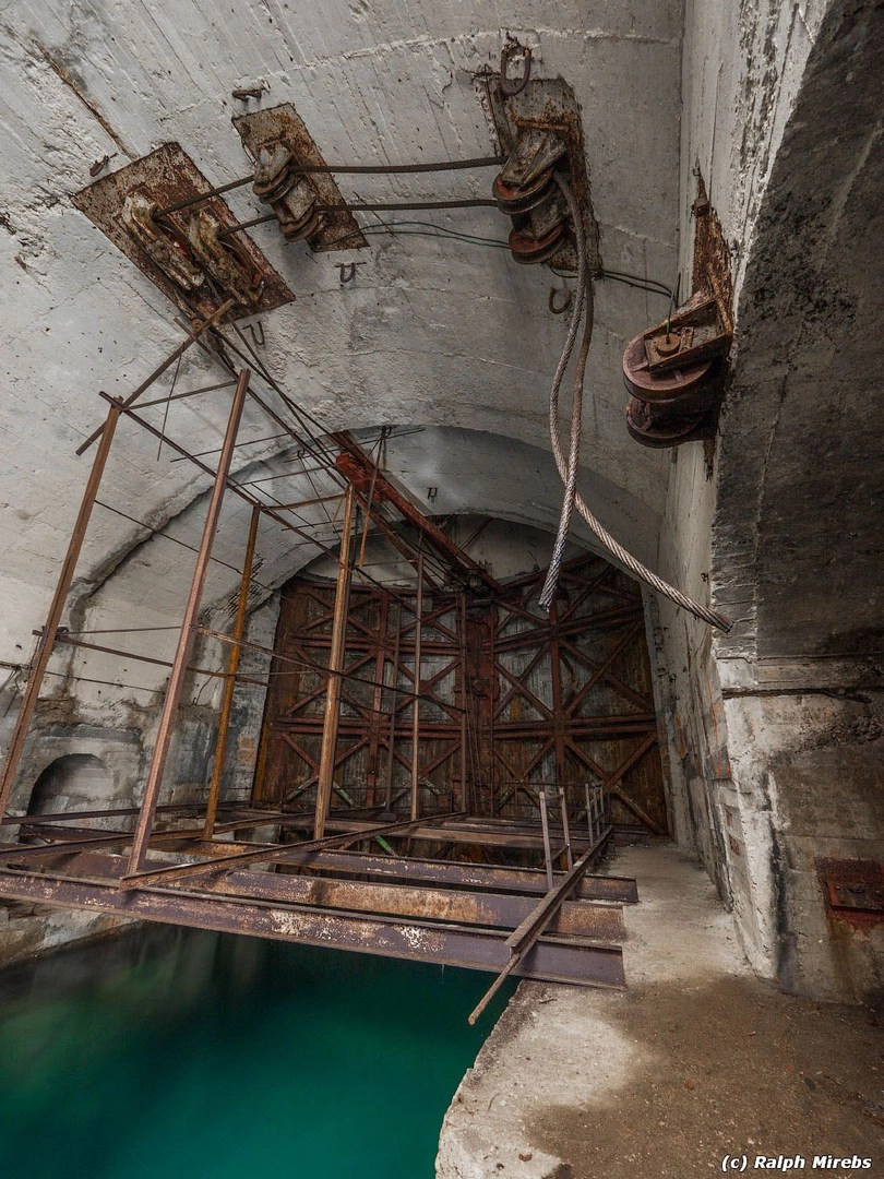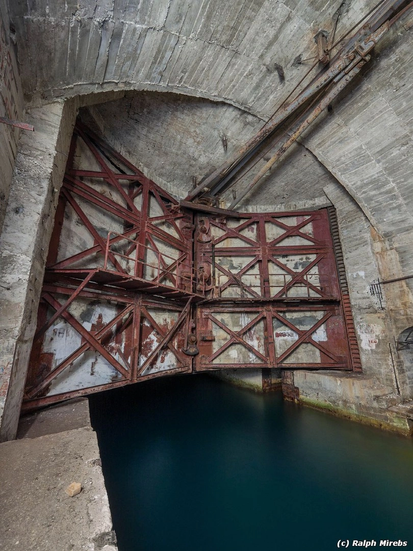 После этого тоннель идет до северного портала, упираясь в плотно запертые ворота, уходящие под воду. Свободно проплыть под ними уже не получится. Более того, ворота обшиты металлом.
