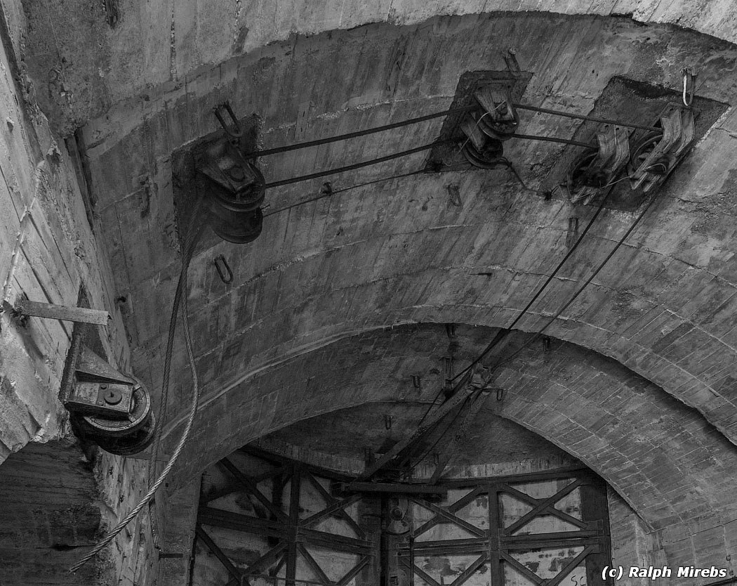Толщина ворот сантиметров с тридцать, они висят на петлях и приводились в действие стальными тросами, пропущенными через серию шкивов. Запоры ворот не закрыты, но приваренная сверху стальная балка не даёт им открыться. Тросы тянула лебёдка, установленная в боковой нише (сохранившаяся лишь в северной части сооружения).