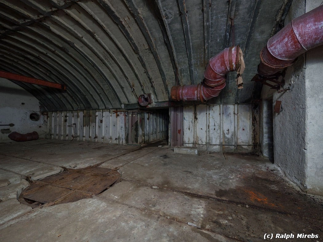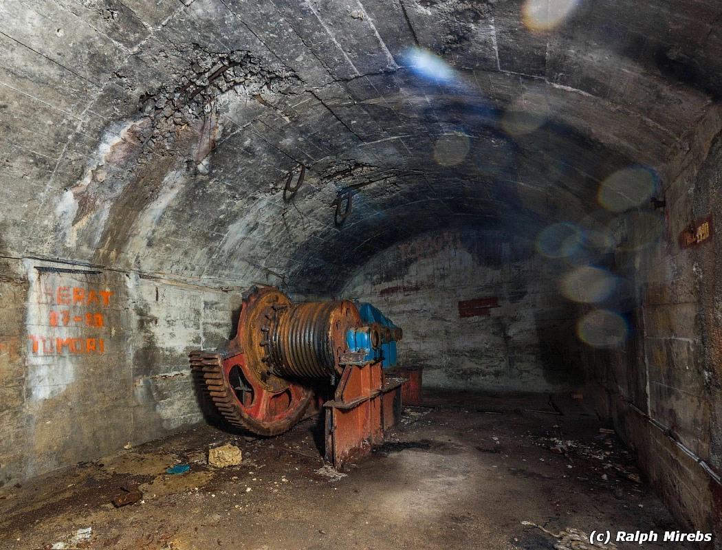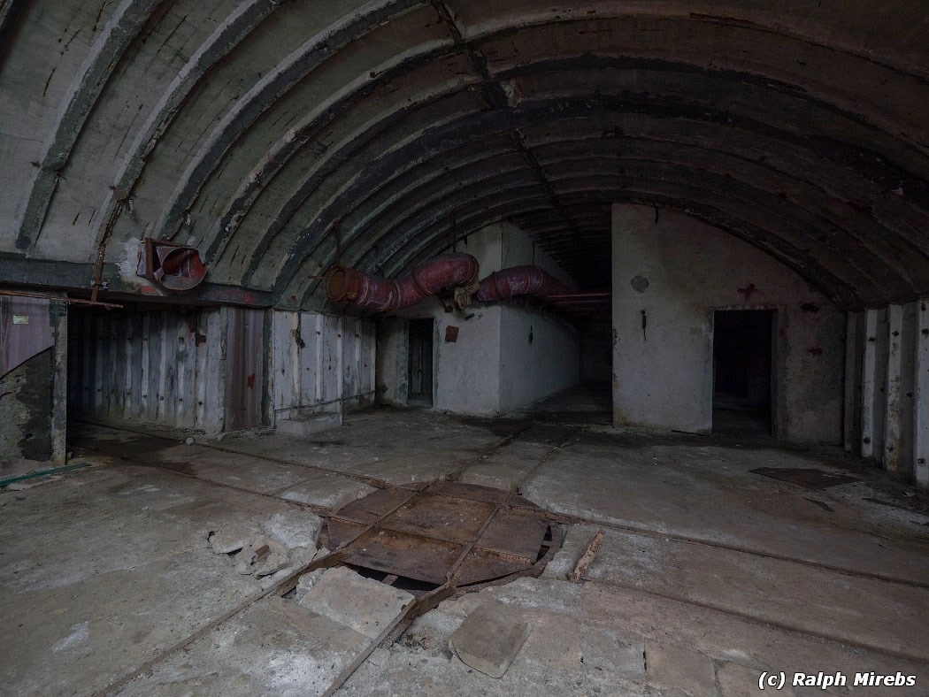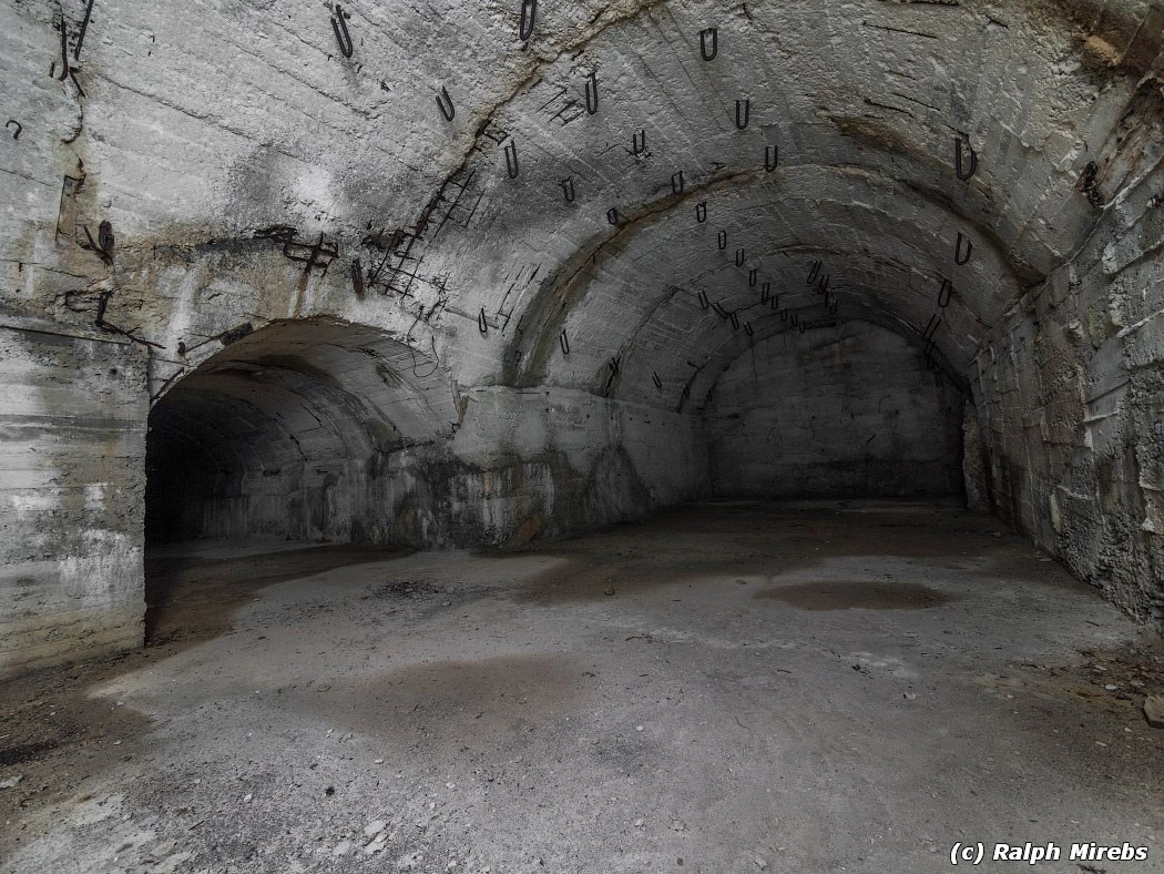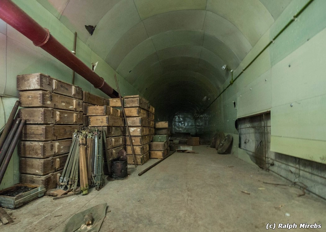 Примерно посередине торпедного хранилища, направо уходит ещё одна штольня. Она выходит в помещение ещё одно арсенала (возможно минный арсенал). Здесь обделка цветным пластиком самая выдающаяся, очень напоминающая 3D-развертку для текстурирования. Под потолком небольшой кран. В дальнем конце арсенала выход из сооружения на поверхность. Иным способом сюда можно попасть по транспортной штольне, что уходит вбок перед командно-техническим блоком.