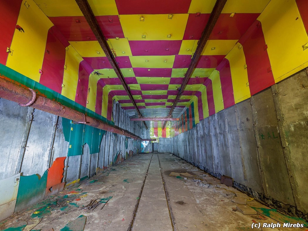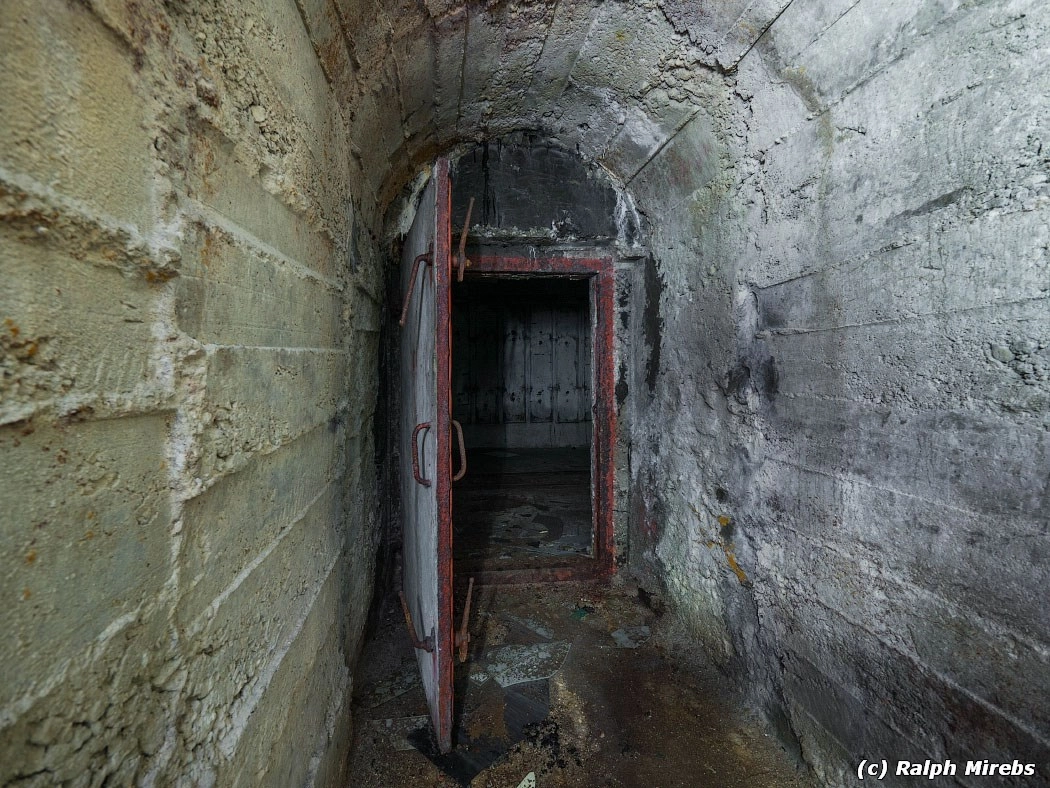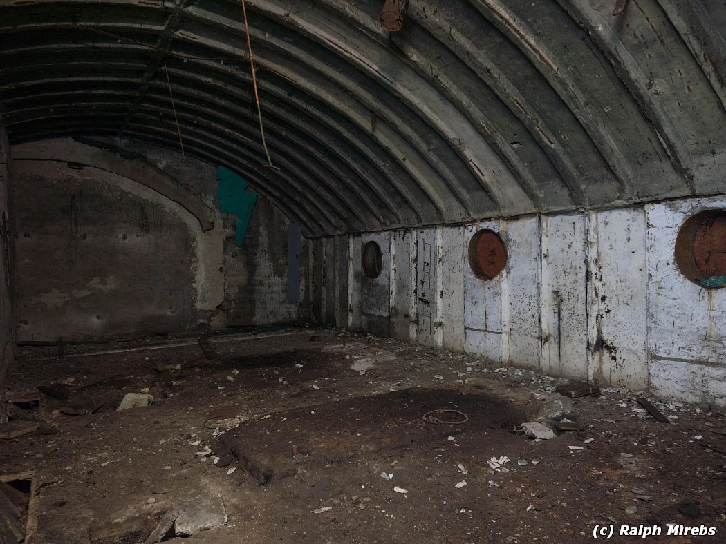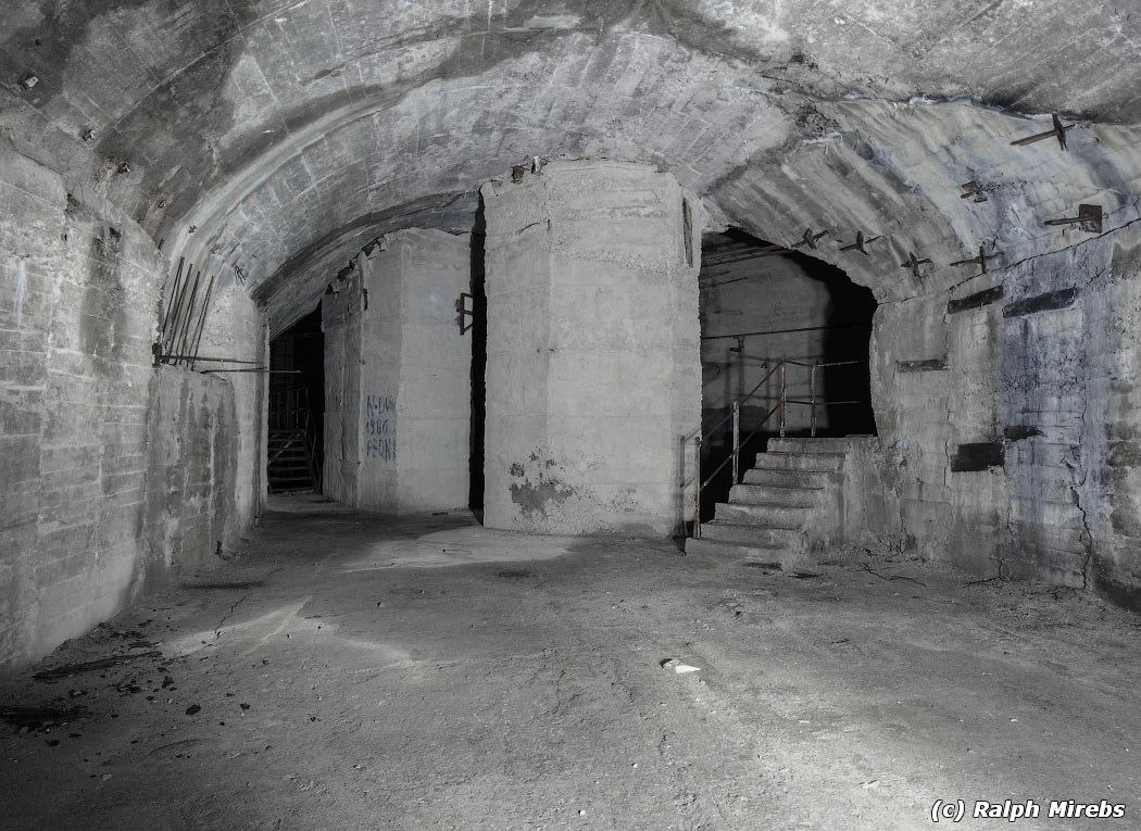 Примерно посередине торпедного хранилища, направо уходит ещё одна штольня. Она выходит в помещение ещё одно арсенала (возможно минный арсенал). Здесь обделка цветным пластиком самая выдающаяся, очень напоминающая 3D-развертку для текстурирования. Под потолком небольшой кран. В дальнем конце арсенала выход из сооружения на поверхность. Иным способом сюда можно попасть по транспортной штольне, что уходит вбок перед командно-техническим блоком.