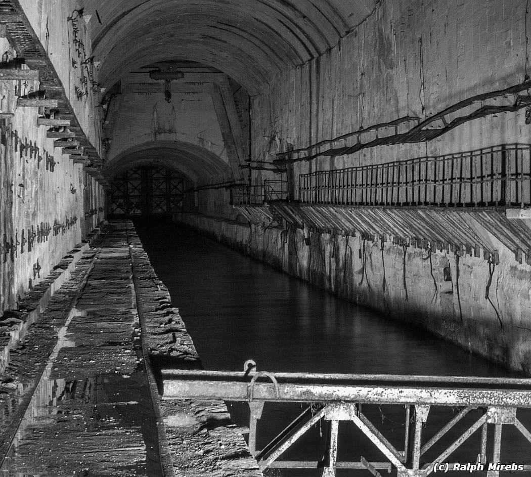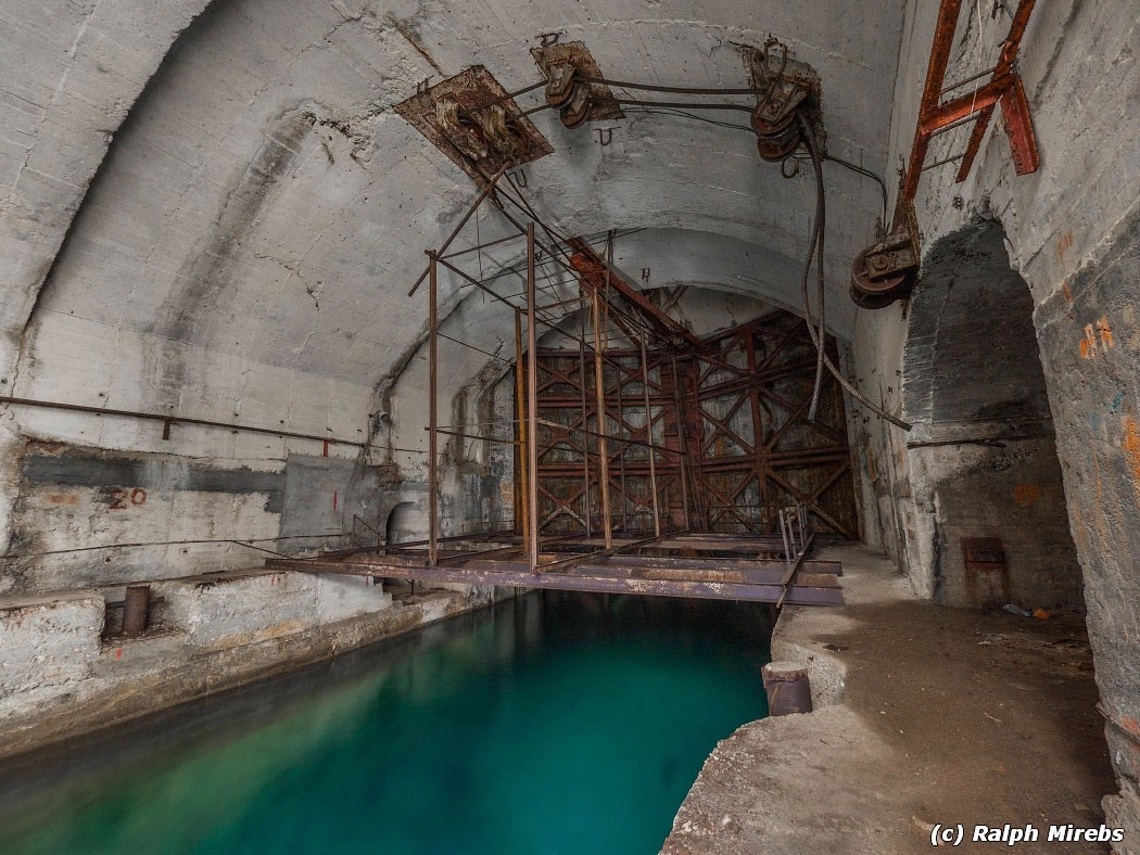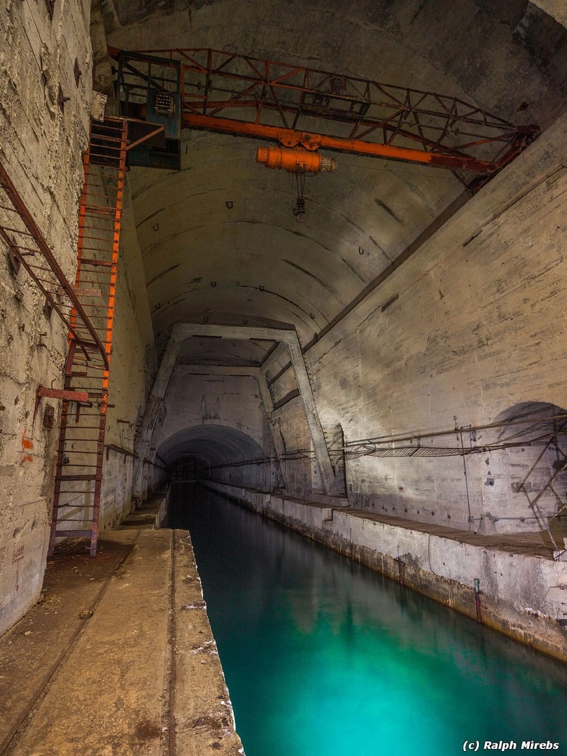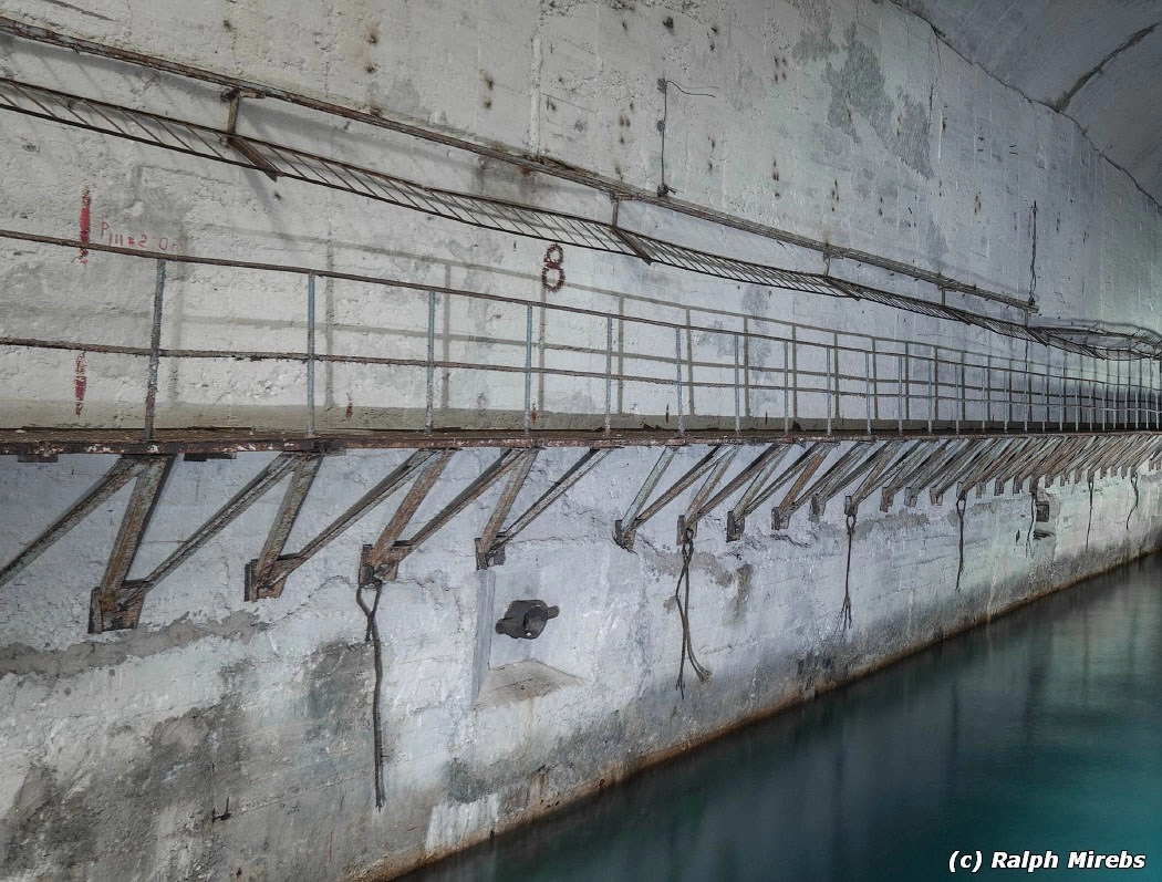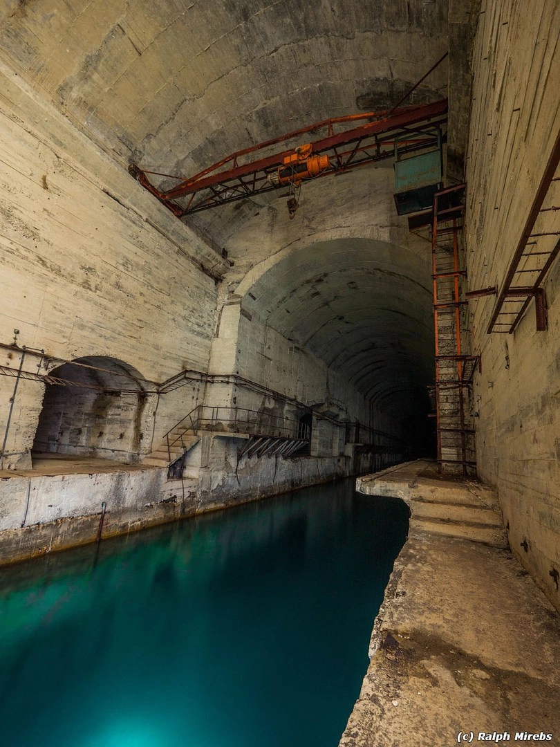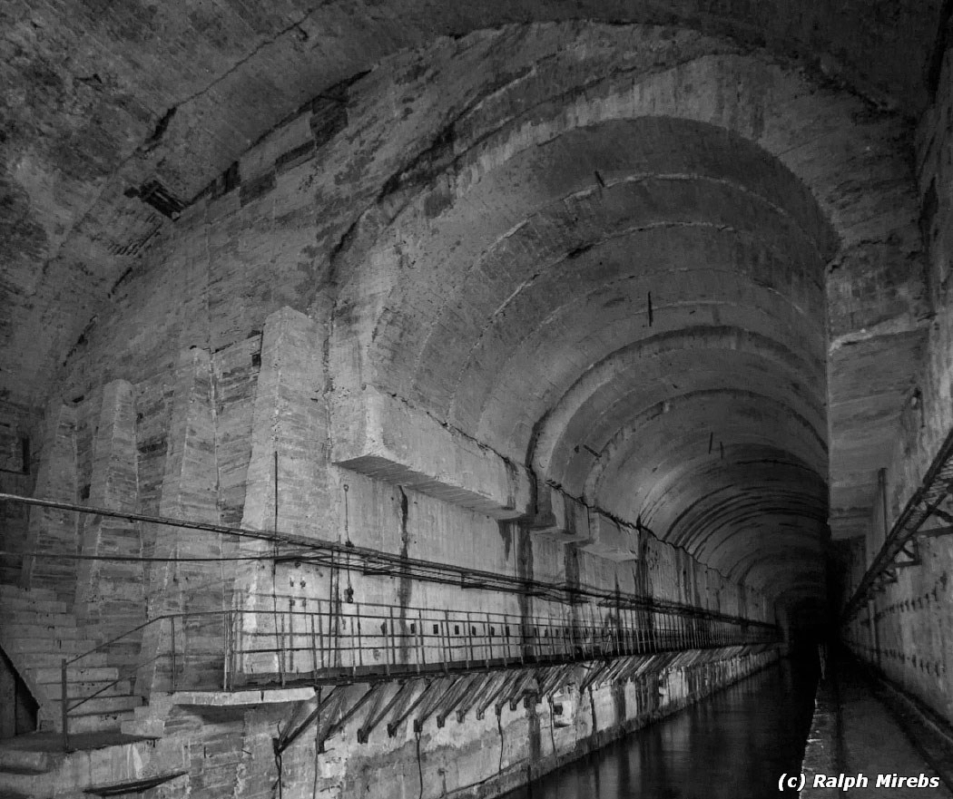 Признаюсь, что мне не удалось сделать точные замеры. Но на стенах местами встречаются пикетажные отметки, согласно которым длина канала составляет около 630 метров. Глубина канала не большая — видно дно. Техническая справка: осадка ракетного катера проекта 205 — 2.6 метра и ширина 7.6 метров, а у подводной лодки проекта 613 — средняя осадка 4.5 метров при ширине 6.64 метра). Туннель водного канала совершенно прямой. С одной стороны с ним сопрягается (посуху) арсенал и командно-технический блок. Никаких вентиляционных или эвакуационных стволов нет.