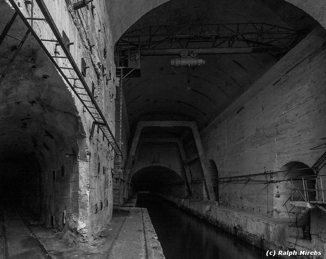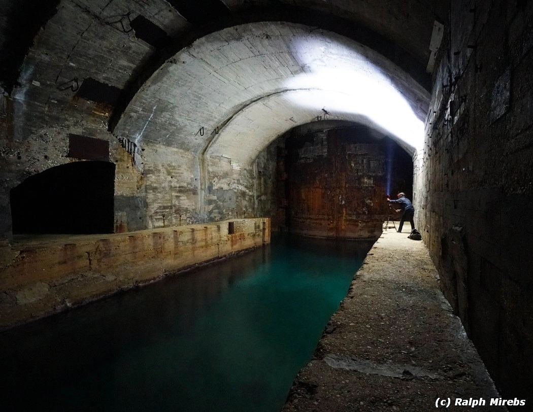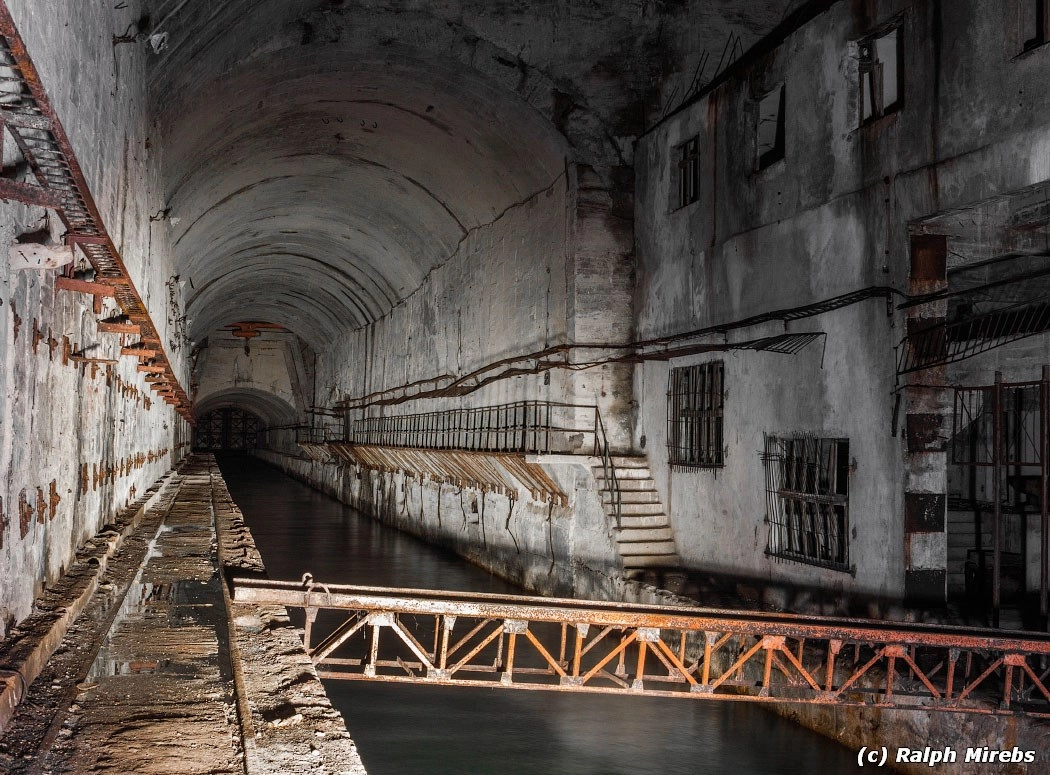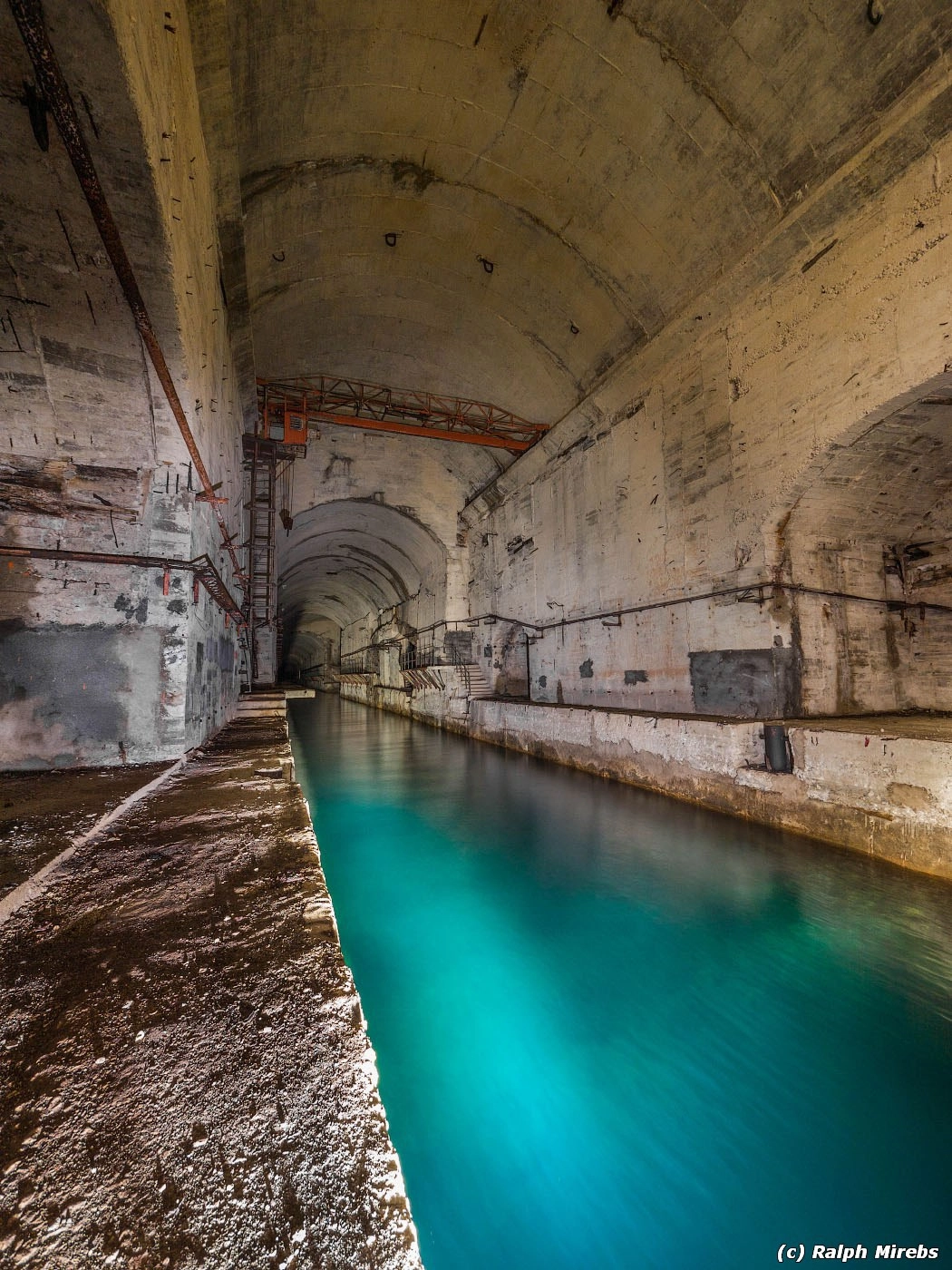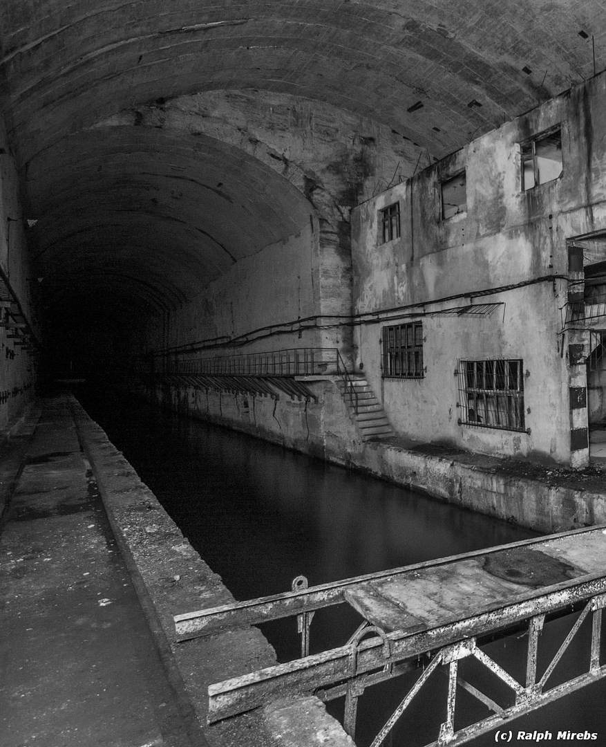 Признаюсь, что мне не удалось сделать точные замеры. Но на стенах местами встречаются пикетажные отметки, согласно которым длина канала составляет около 630 метров. Глубина канала не большая — видно дно. Техническая справка: осадка ракетного катера проекта 205 — 2.6 метра и ширина 7.6 метров, а у подводной лодки проекта 613 — средняя осадка 4.5 метров при ширине 6.64 метра). Туннель водного канала совершенно прямой. С одной стороны с ним сопрягается (посуху) арсенал и командно-технический блок. Никаких вентиляционных или эвакуационных стволов нет.