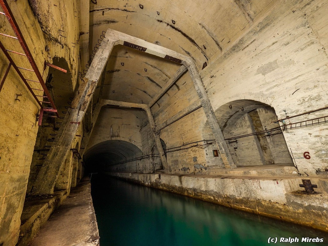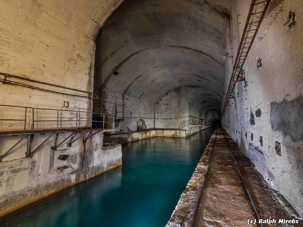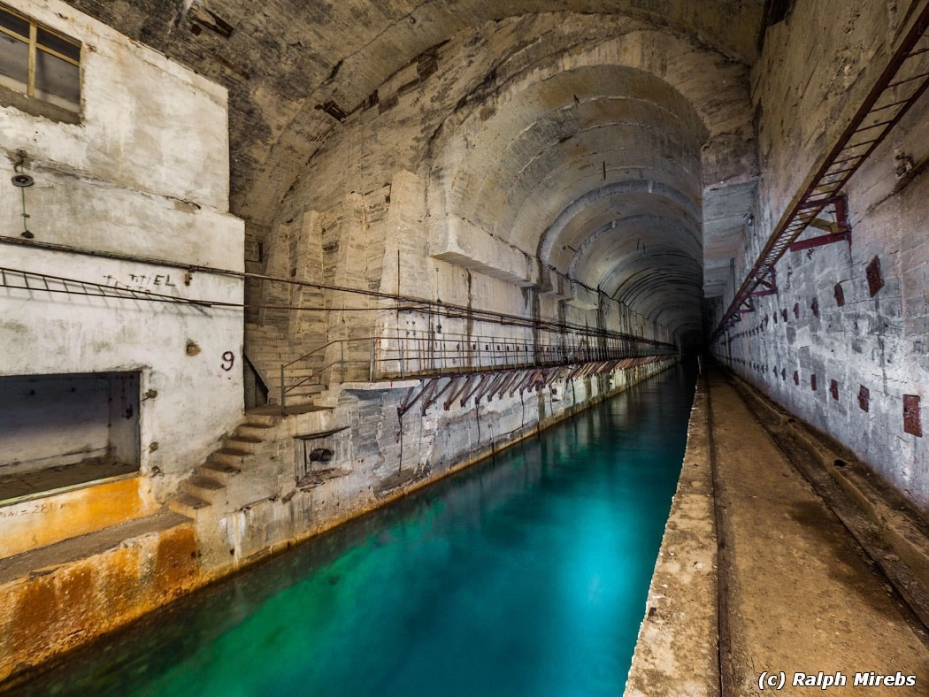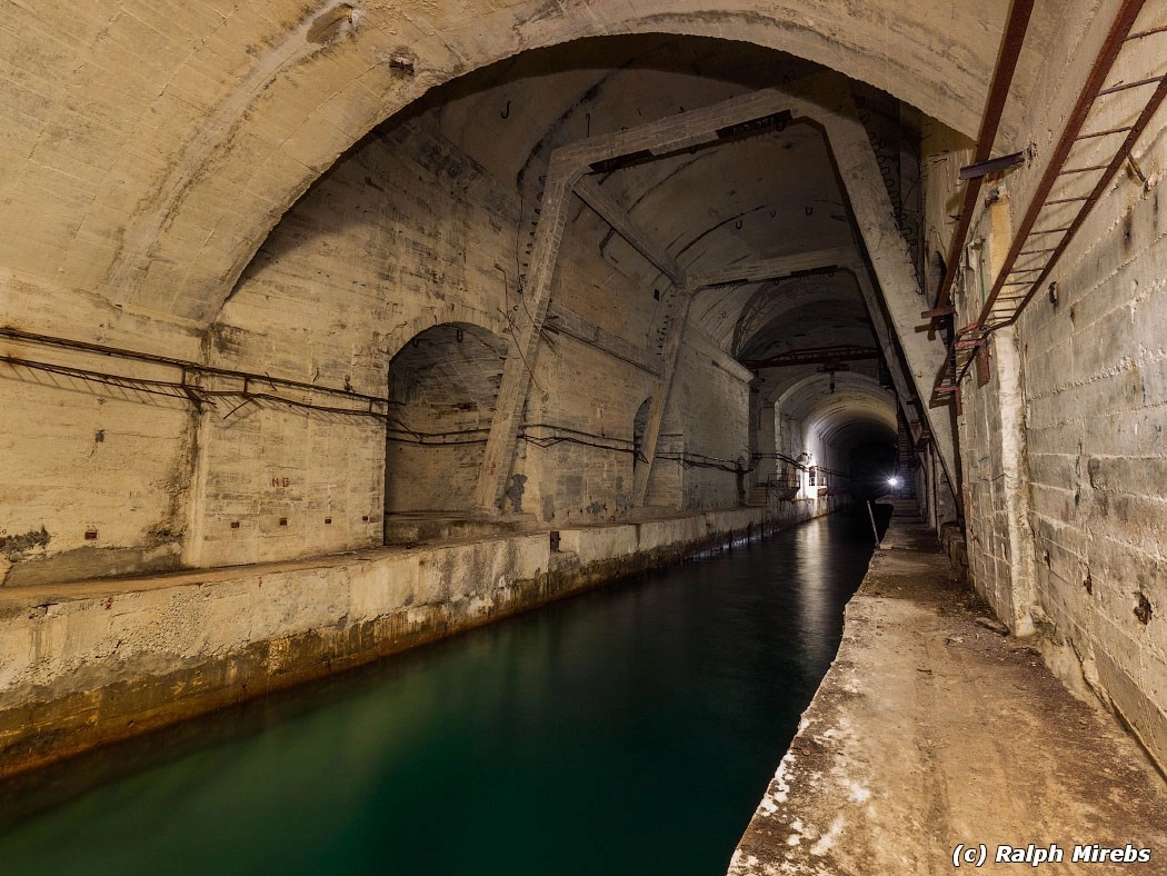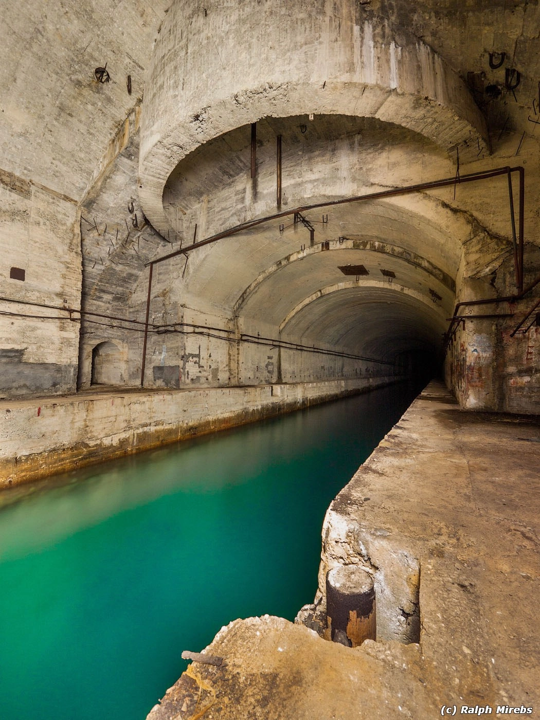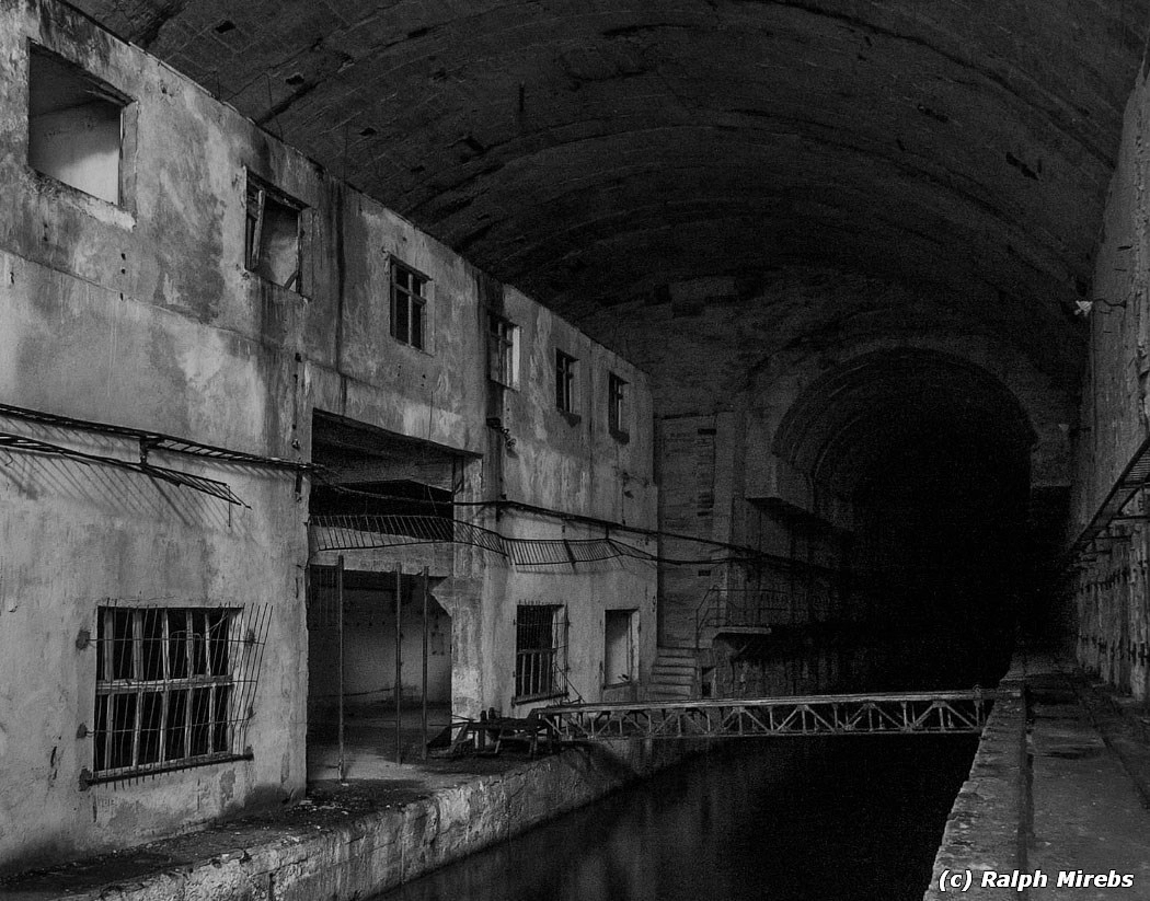 Признаюсь, что мне не удалось сделать точные замеры. Но на стенах местами встречаются пикетажные отметки, согласно которым длина канала составляет около 630 метров. Глубина канала не большая — видно дно. Техническая справка: осадка ракетного катера проекта 205 — 2.6 метра и ширина 7.6 метров, а у подводной лодки проекта 613 — средняя осадка 4.5 метров при ширине 6.64 метра). Туннель водного канала совершенно прямой. С одной стороны с ним сопрягается (посуху) арсенал и командно-технический блок. Никаких вентиляционных или эвакуационных стволов нет.
