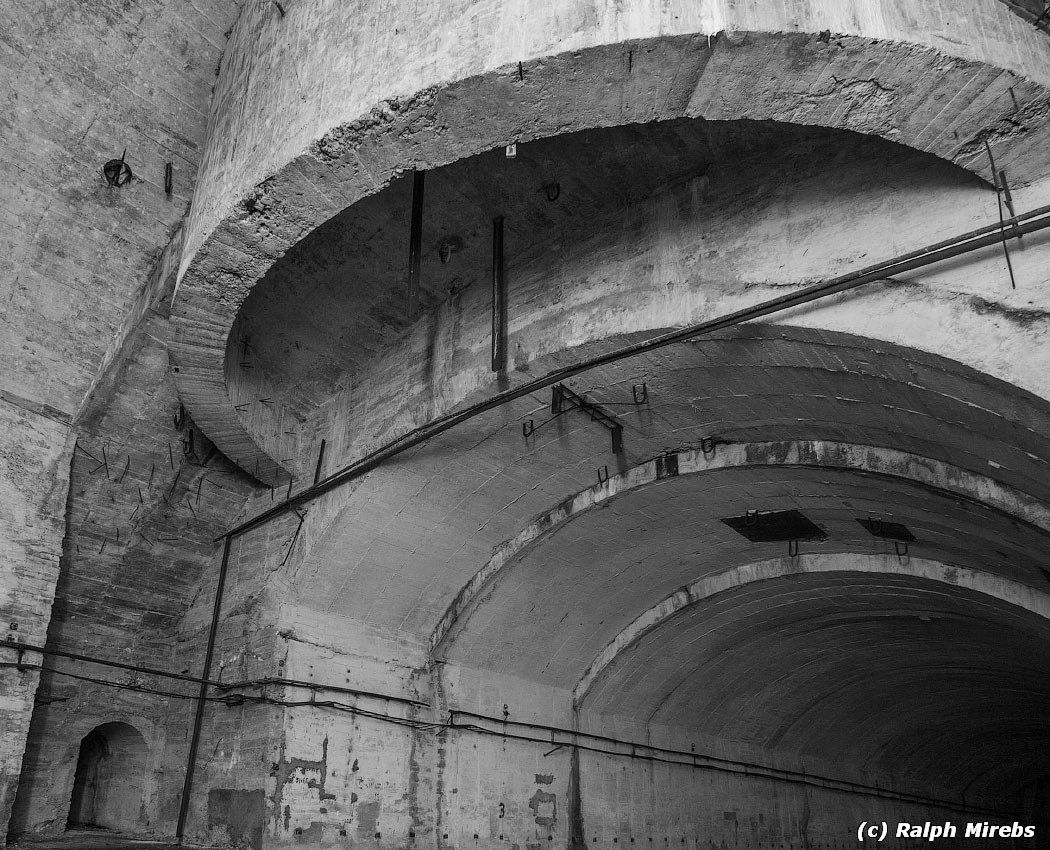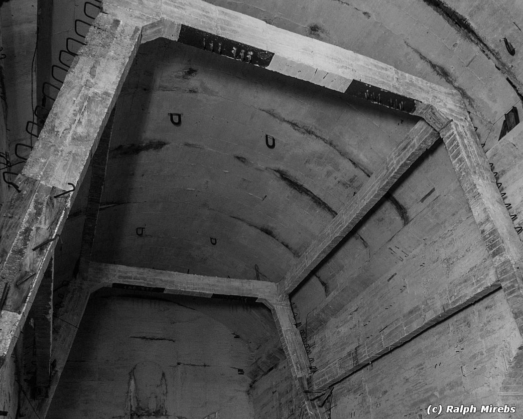 Продолжим движение вдоль канала. Тут должны были быть смонтированы ещё одни защитные ворота, перекрывающие весь канал. В своде сделали характерную арку-направляющую, прошли нишу под лебедку и установили крепеж для блоков. А с противоположного конца тоннеля задела под вторые ворота нет.