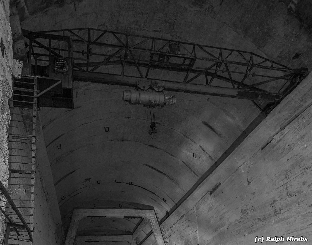 Через несколько десятков метров, высота свода канала увеличивается в два раза, организуя рабочее пространство для подъёмного крана-балки. Кран ездил по двум направляющим вдоль оси канала и сохранился до настоящего времени в отличном состоянии.