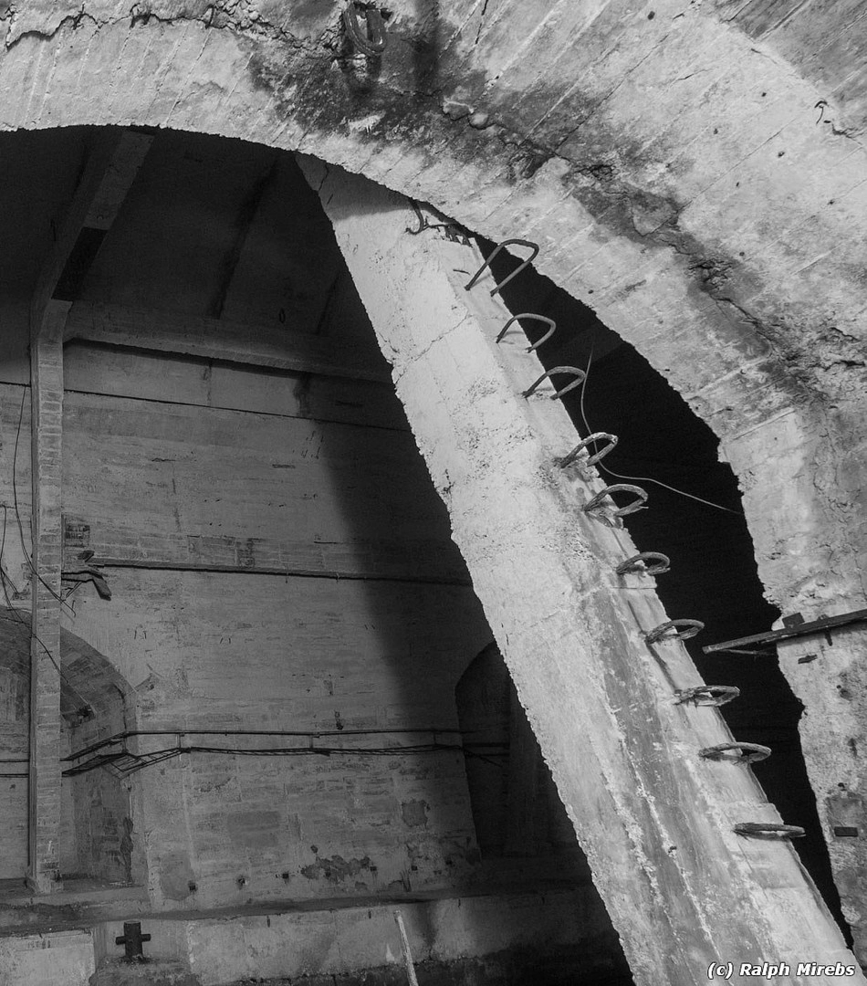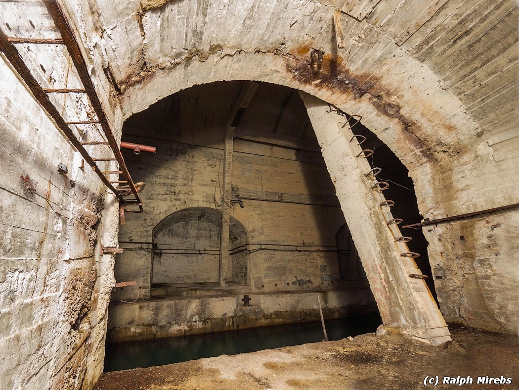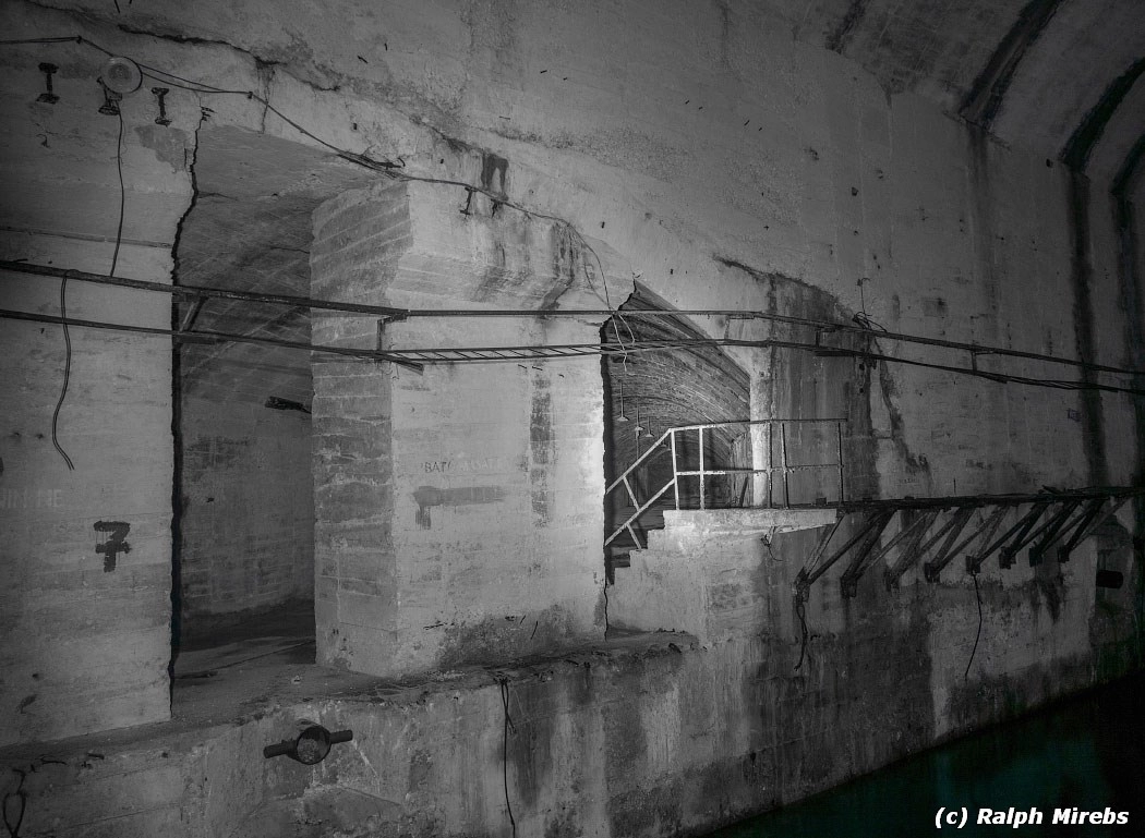 Немногим далее тоннель опять уширяется влево. На этот раз там просто вода — тут могли разойтись два корабля. В стене пройдено две неглубокие ниши. Из-за гнилых пешеходных мостиков это самое труднодоступное место в сооружении.