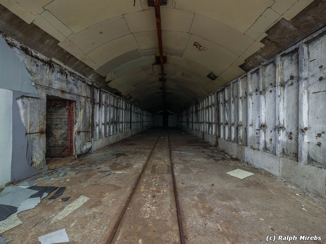 На дальней границе действия крана, по одному из бортиков начинается узколейка. По ней из арсенала должны были подвозить боеприпасы. Для удобства приёма изделий на погрузку, бортики здесь поднимаются на полтора метра вверх. Свод же, наоборот, понижается, но не до прежней высоты.