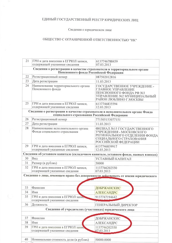 А этот самый второй участник переговоров Александрс Дображанскис, как выяснилось, не числится в «МКБ», а возглавляет точно такую же контору под названием ООО «НК», также специализирующуюся на «денежных ссудах под залог недвижимости» и «посреднических слугах, связанных с недвижимостью». Вот выписка из реестра: