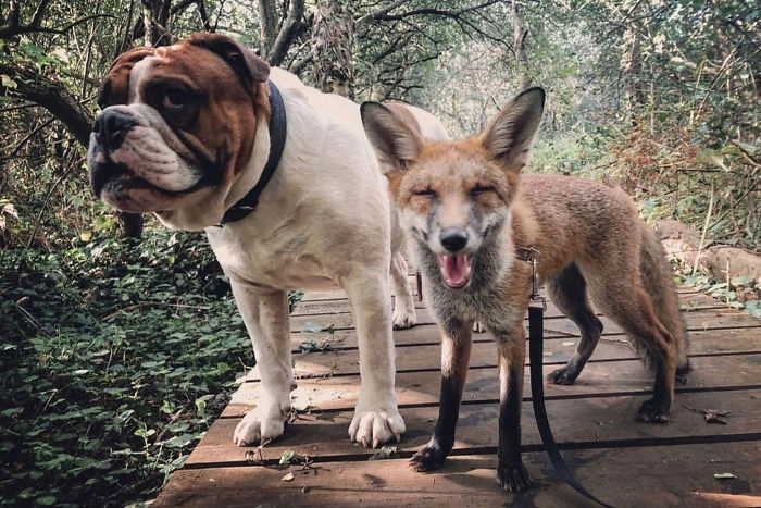 Как в мультфильме: соцсети покорила трогательная дружба лисицы и бульдога