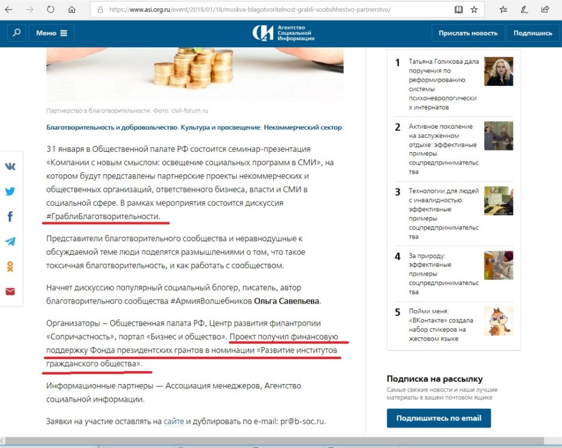 Организаторы мероприятия ввели всех в заблуждение, указав его в числе партнеров на своем сайте и на сайте Агентства социальной информации. Таким образом, статья осталась на месте, а виртуальный скандал был молча удален с официальной страницы издания «Бизнес и общество» в Facebook. Как и не было его. Разумеется, никаких извинений ни от Татьяны Бачинской, ни от Ольги Савельевой я не получила, а на сайте АСИ до сих пор висит объявление об участии Фонда президентских грантов в финансировании этого мероприятия.