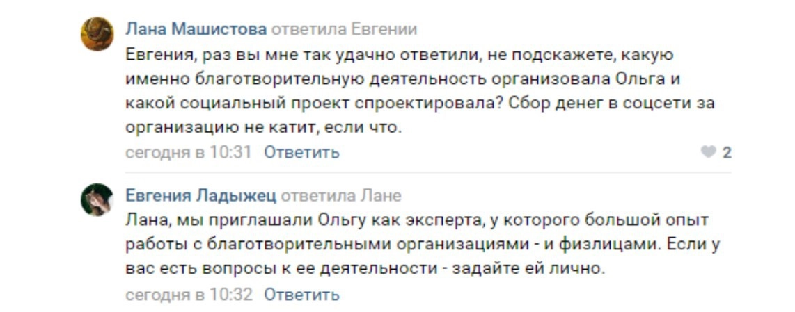 Оставлю в стороне вопрос, сколько благотворительных проектов организовала Савельева и сколько успешных социальных бизнесов успела построить, чтобы стать экспертом в социальном проектировании. Спросить саму Ольгу я не могу, она меня заблокировала за попытку помочь с отчетами, а организатор встречи в Ижевске от ответа технично уклонилась.