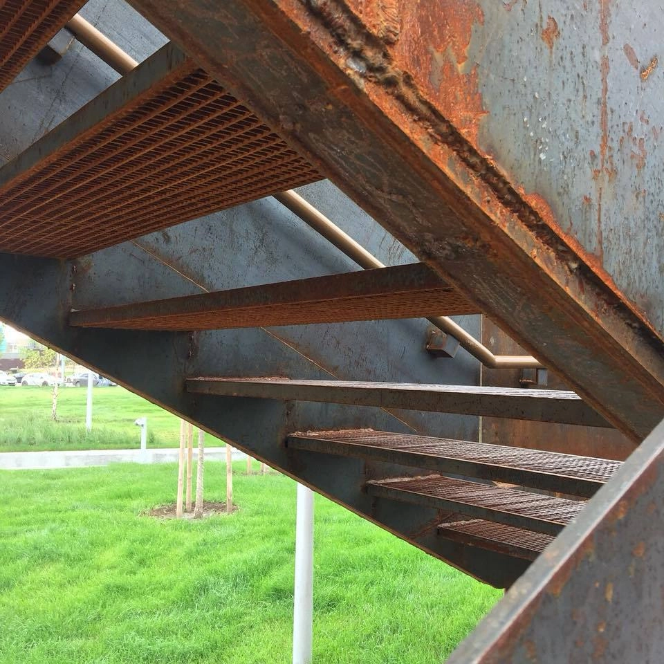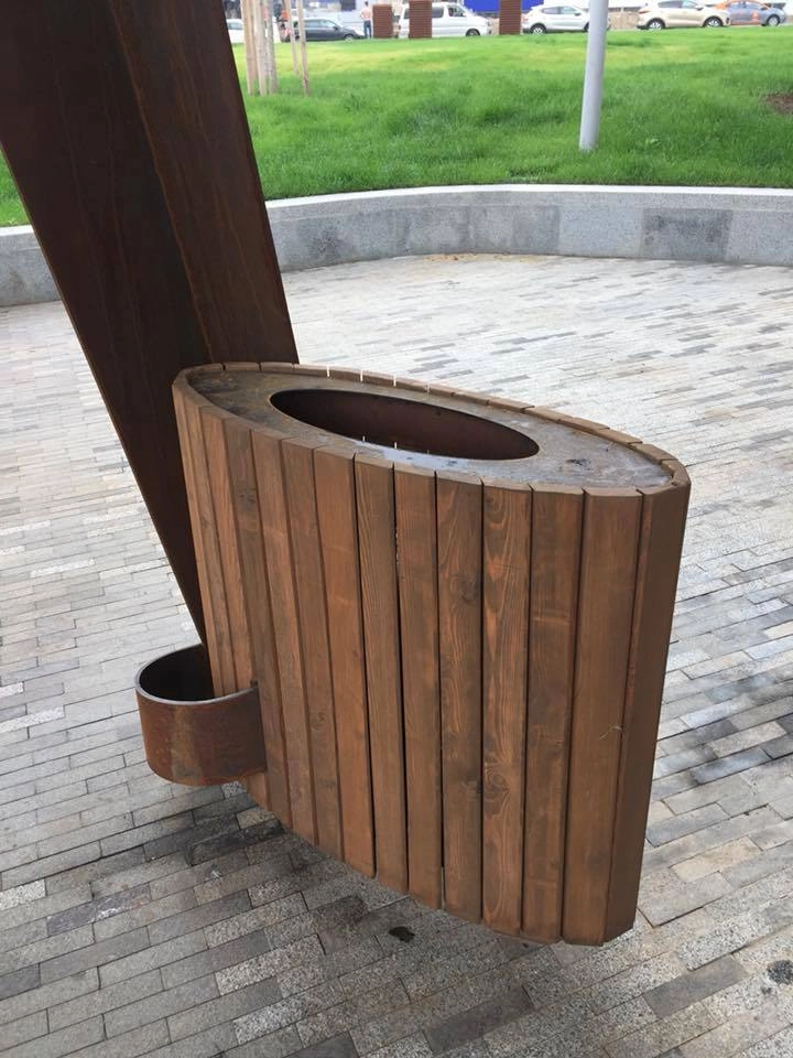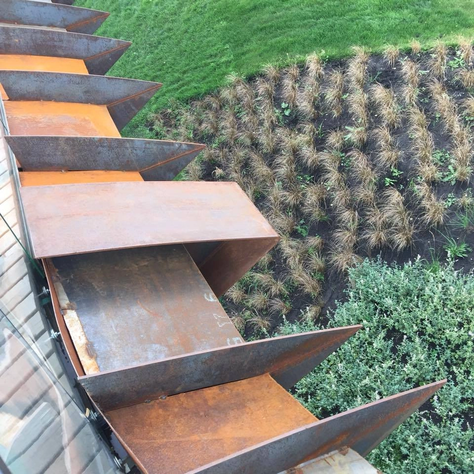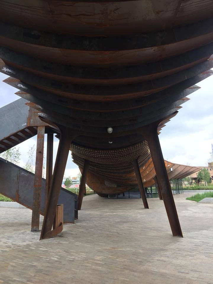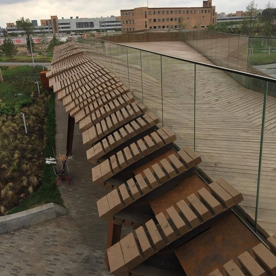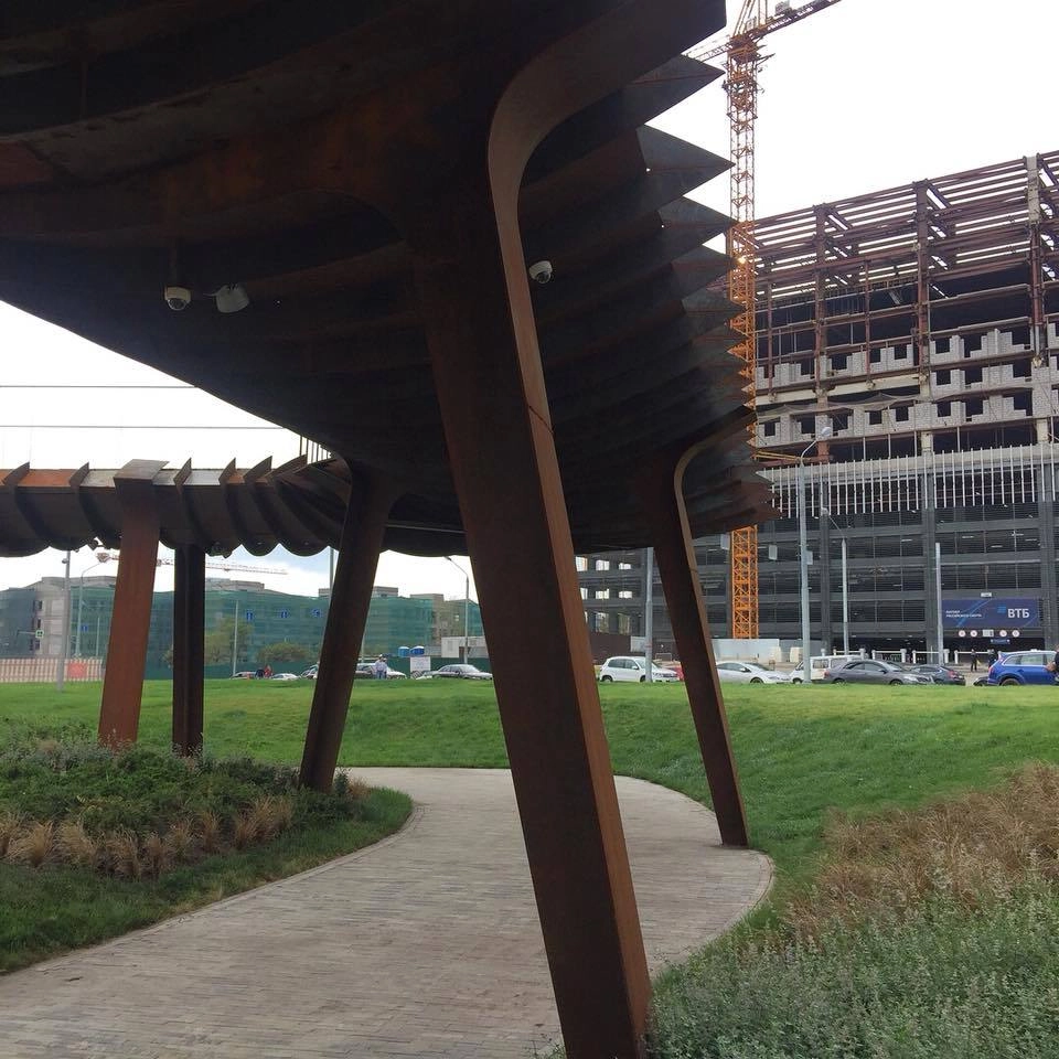 Длинная пергола из специально заржавленного железа, хищные зубастые ржавые детали, коричневый выцветший стимпанковский цвет, вогнутые и выпуклые линии, скамейки-волчки.