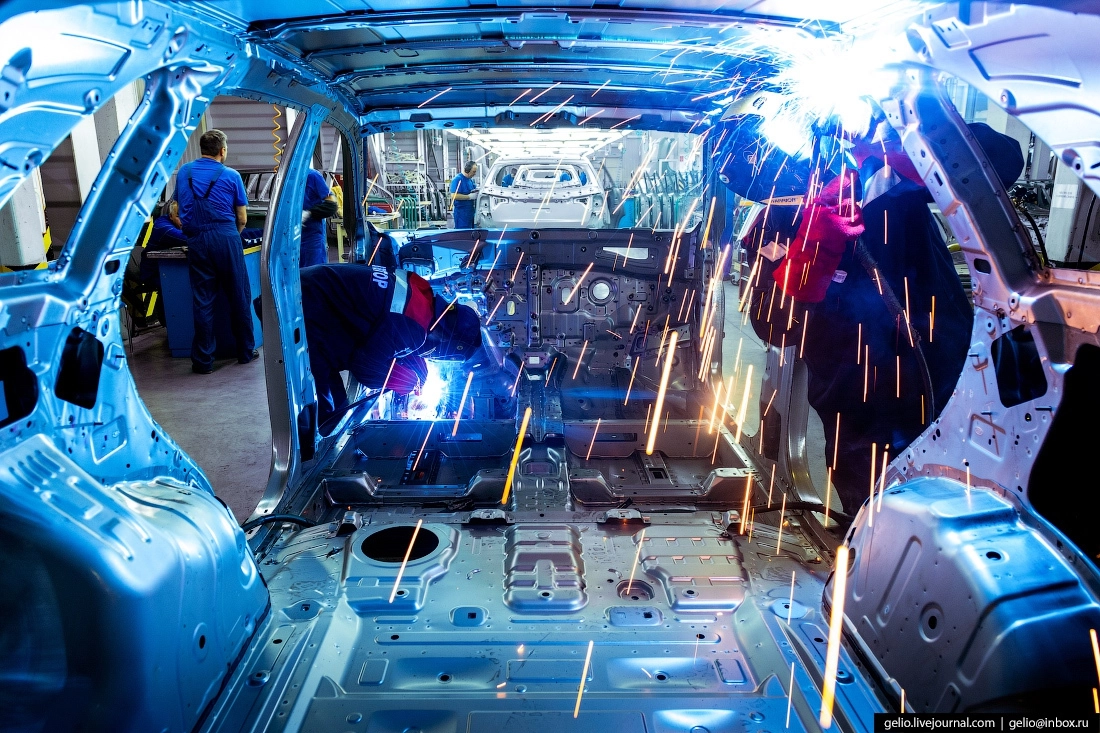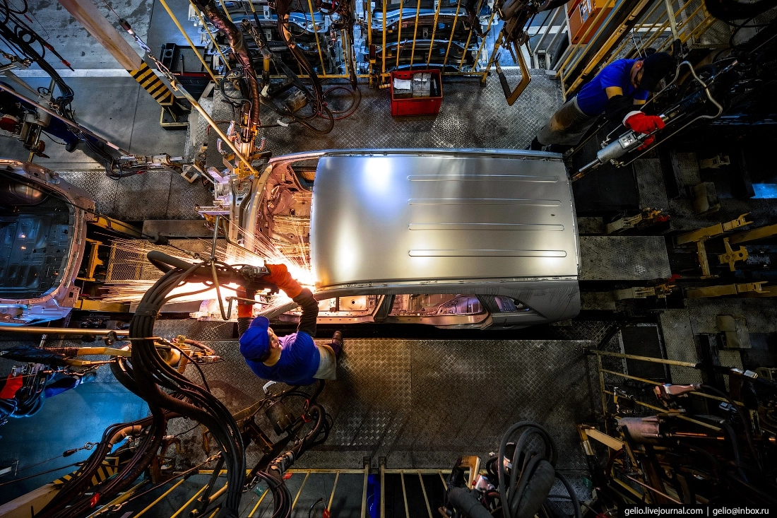 Отсюда продукцию отправляют на главный сварочный кондуктор, где из отдельных элементов формируют кузов. Будущие автомобили сходят с конвейера каждые 7 минут, столько же времени кузов находится на каждом из сварочных постов.