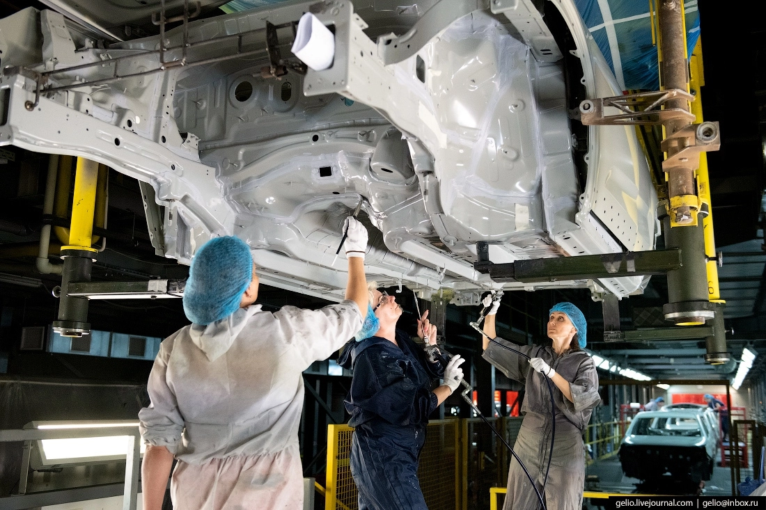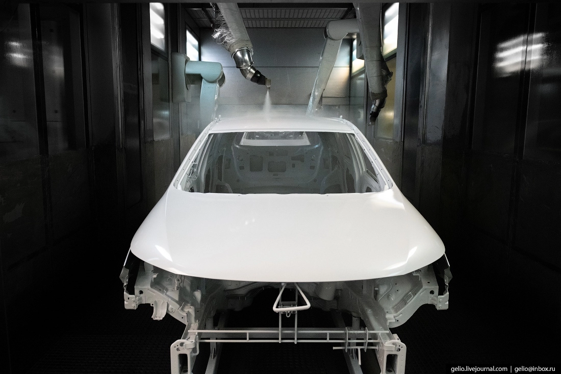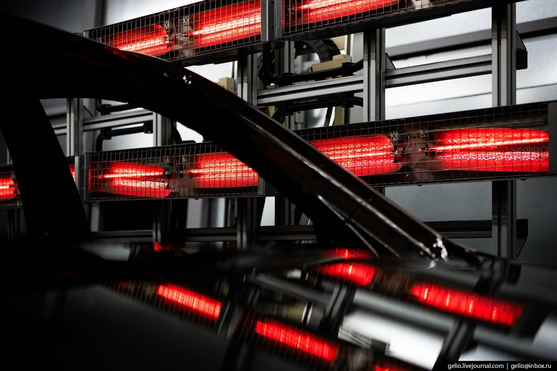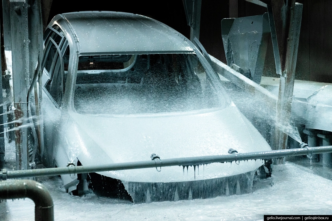 Перед грунтованием и окраской кузов нужно очистить и подготовить. Для этого он проходит через промывочные ванны и процесс катафореза, в результате которого на металл наносится защитный слой, предохраняющий от коррозии. Всего на линии катафореза установлено 8 ванн.