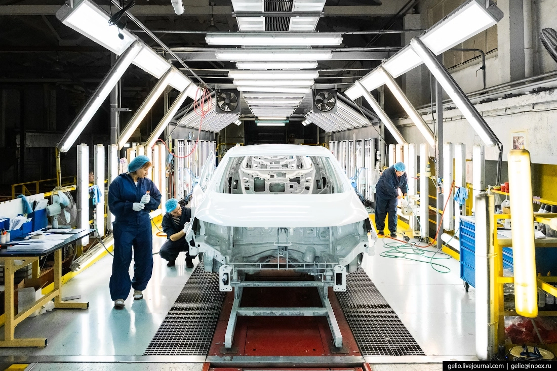 Это участок контроля. Здесь свежеокрашенный кузов полируют, чтобы добиться идеально гладкого покрытия.