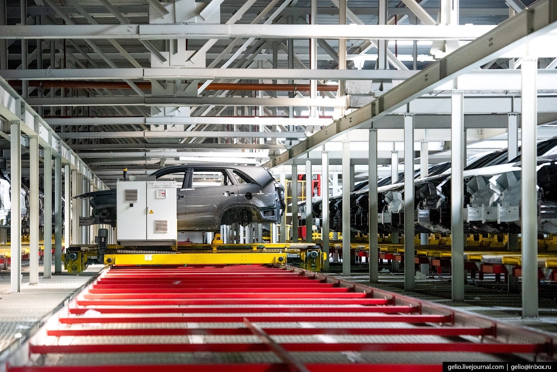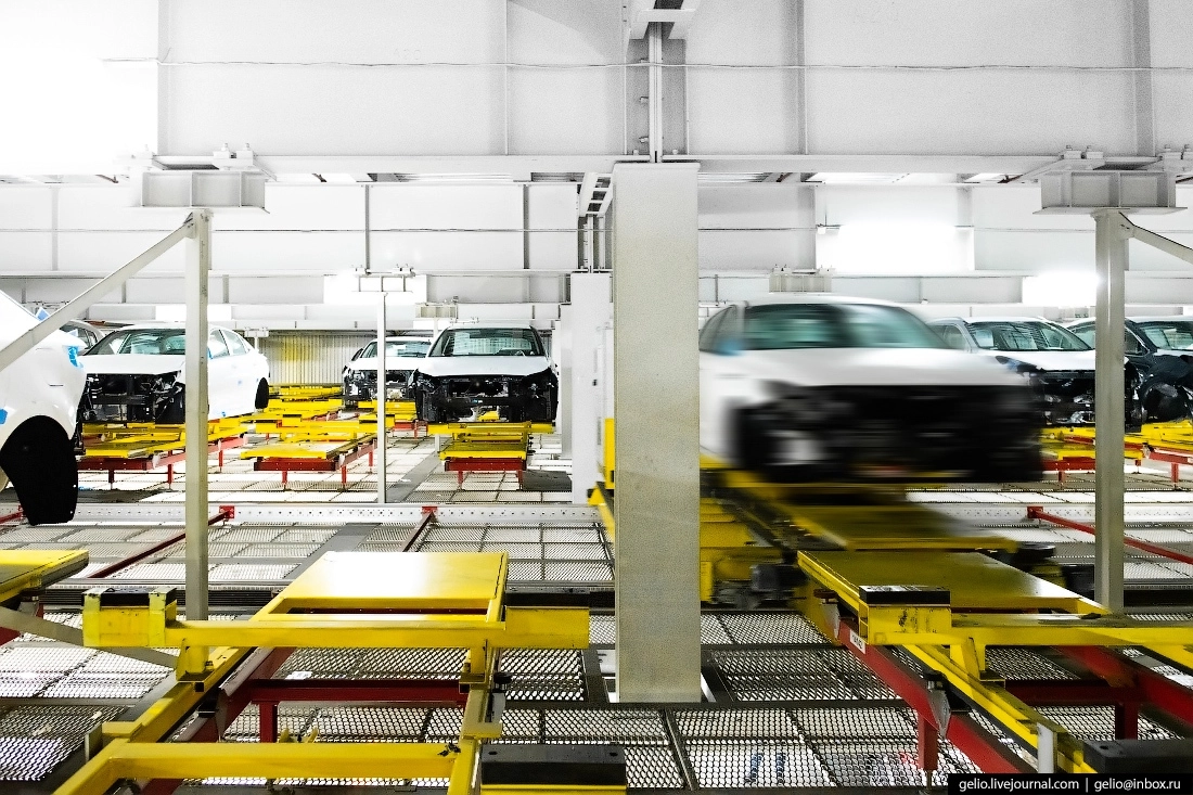 Перед тем, как поступить на конвейер, кузова попадают в специальный накопитель. Оттуда их доставляют с помощью автоматизированной транспортной системы.