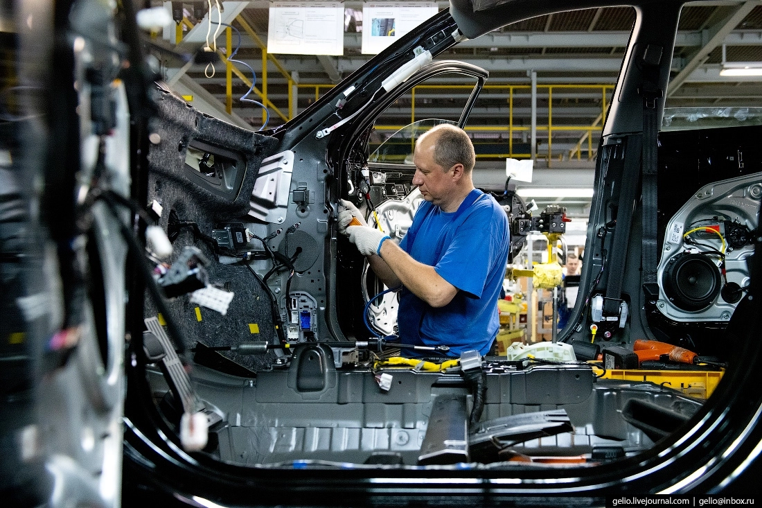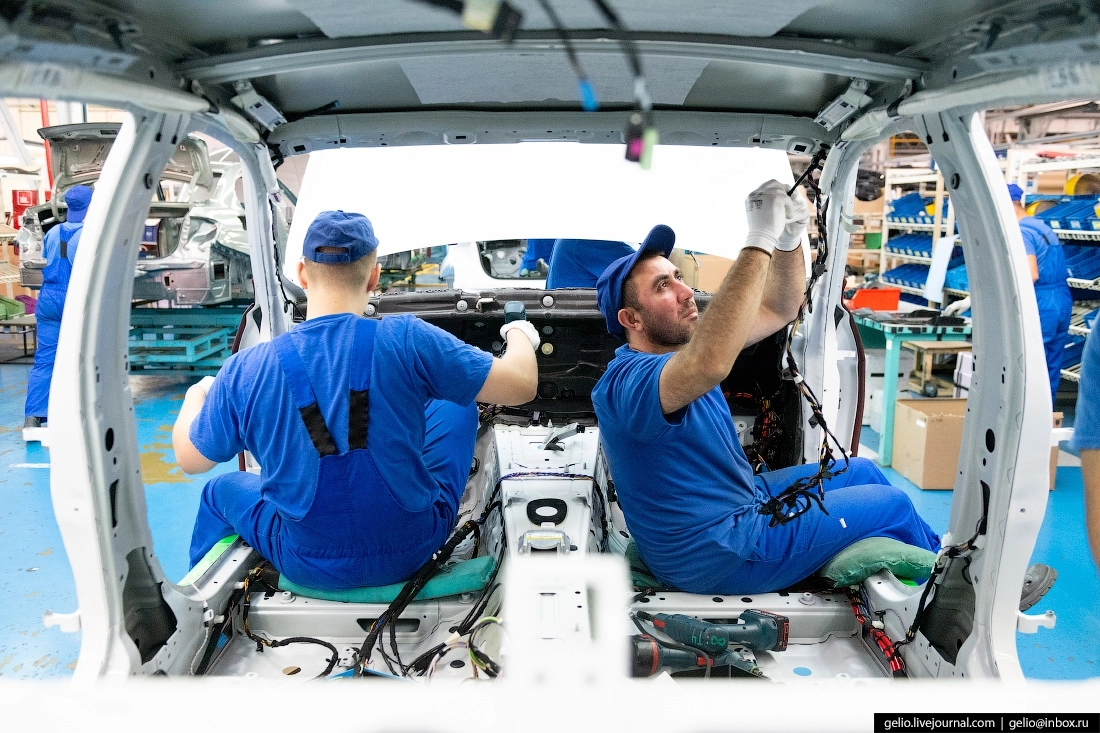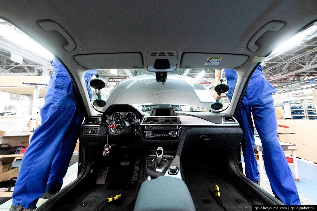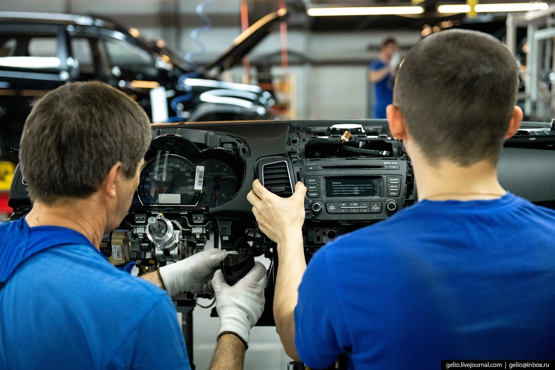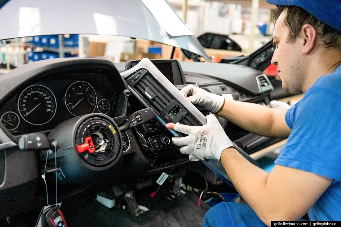 В сборочном цехе происходит множество операций, таких как вклейка стёкол или затяжка колес. На этом участке подсобирают панель приборов, чтобы установить её в автомобиль.