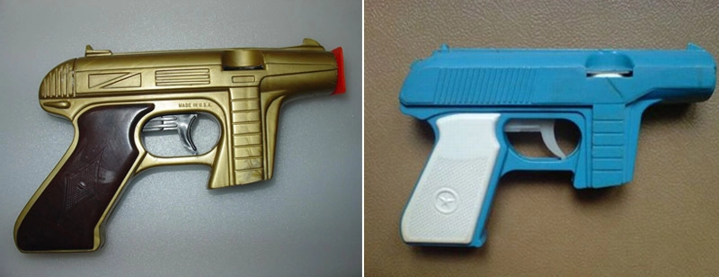 03. «Tracer Gun», 1966 и пистолет, 1988. Помните такой синий советский пистик, стреляющий дисками? У детей конца восьмидесятых-начала девяностых это была очень модная игрушка. Внутри пистолета была пружина, которая при нажатии на курок «выплевывала» пластиковые диски, что заряжались в обойму сбоку.