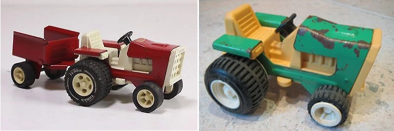 04. «Tonka Tractor, 1967» и трактор «Петрушка», 1984. Ещё одна игрушка из моего детства — с таким тракторчиком было классно играть в песочнице — правда, в ребристые колёса быстро набивались камушки, их потом приходилось чистить палочкой от мороженого или спичкой. Как можно увидеть — игрушка была полностью скопирована с «Tonka Reactor», что вышел аж в семидесятые годы, причем в отличие от пистолета выше (там хоть дизайн поменяли) здесь содрали всё «в ноль» — раскладку накладной металлической части, дизайн колес, сидения и радиаторов, компоновку и количество деталей