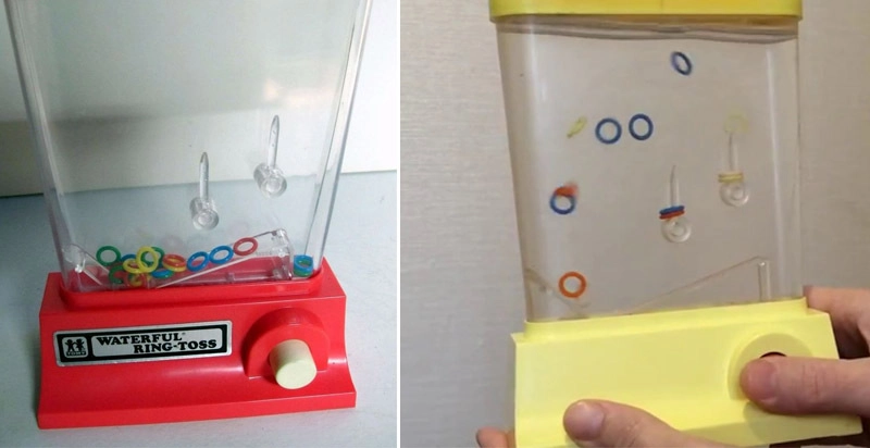 05. «Tomy Waterful ring-toss», 1976 и «Жонглер, 1986. Переходим к водным процедурам. Помните такую необычную игру под названием «Жонглер», в которой основой игрового процесса были жидкостные свойства воды? В игре была одна кнопка, которая работала как насос — нажимая ее с разной силой, можно было регулировать потоки воды и подбрасывать плавающие внутри колбы колечки. Целью игры было нанизать как можно больше колечек на два вертикальных штырька из оргстекла.