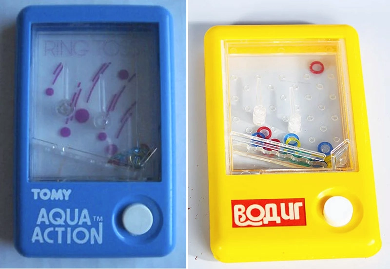 06. «Tommy Aqua Action», 1983 и «Водинг», 1989. Ещё одна «водная» игрушка. Тут комментировать особо нечего — по году создания понятно, что советская игра появилась на 6 лет позже оригинальной.