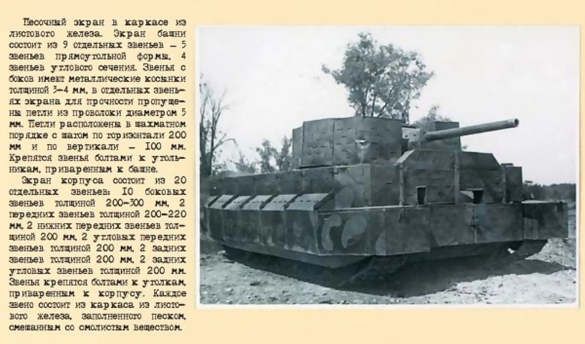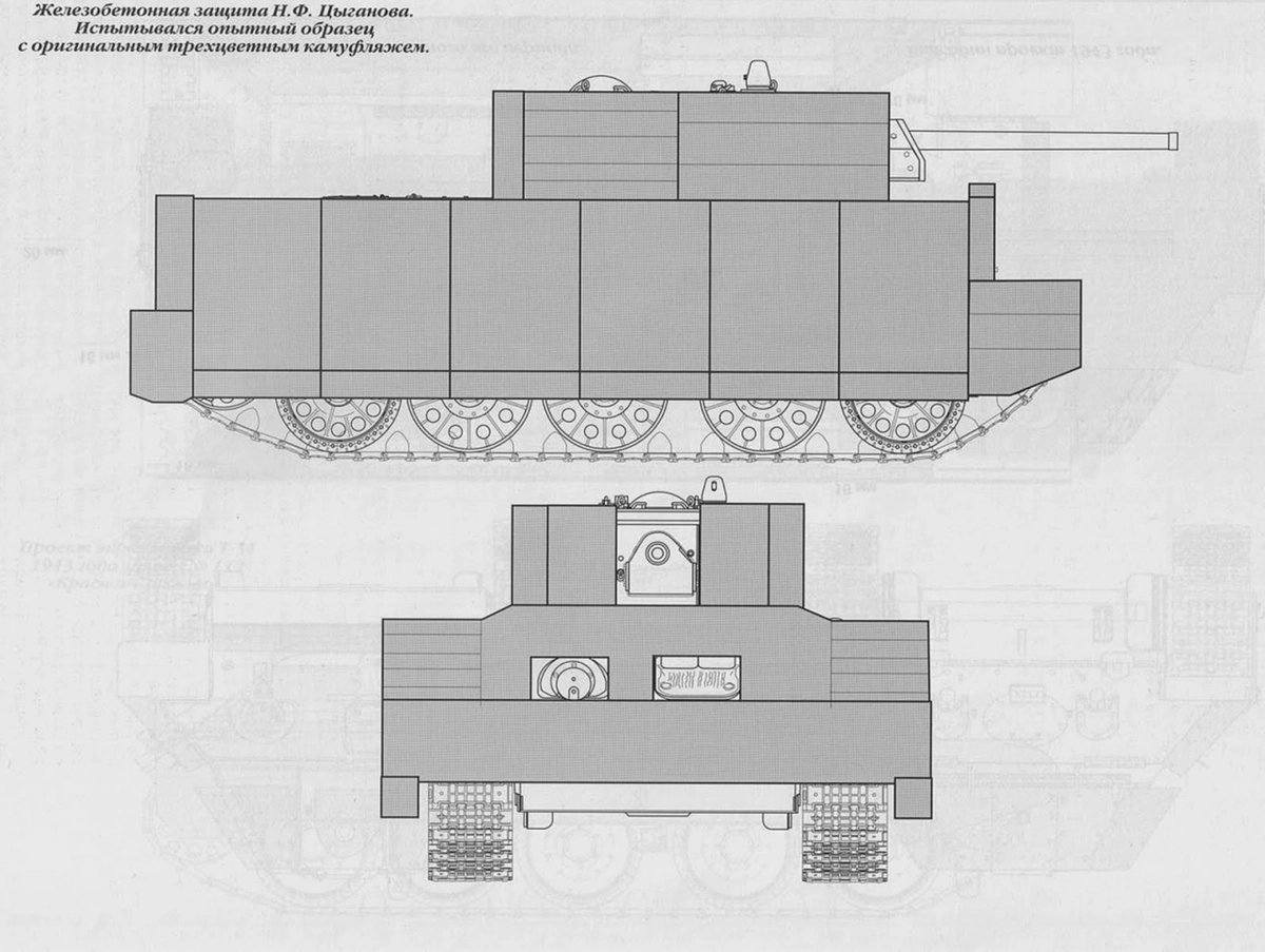 Существовало два варианта исполнения — облегченный, на котором экранировались только борт и подкрылки, и усиленный, где экранировалась еще и башня. Нельзя не упомянуть и о железобетонном проекте Цыганова, испытанном в 1943 году. Вокруг корпуса и башни укреплялась стальная конструкция с бетонными блоками.