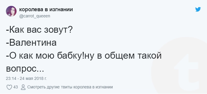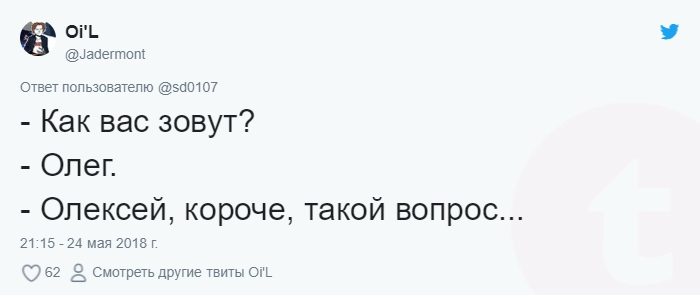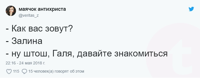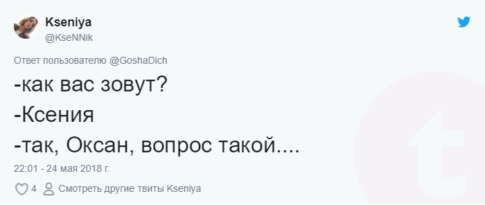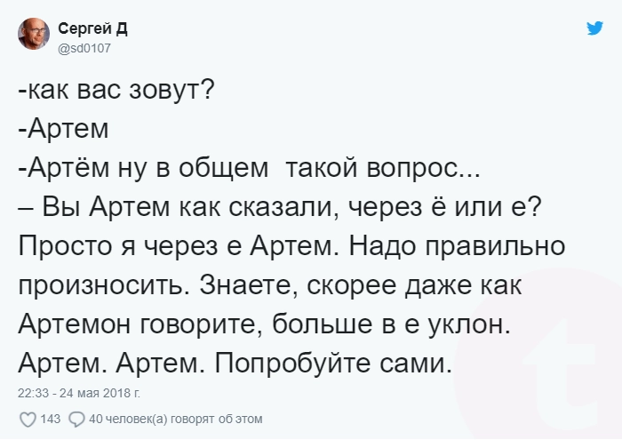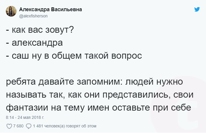 Психологи уверены: самый приятный для человека звук — это звук его имени. Однако некоторые люди не только не дают себе труд запомнить имя собеседника, но ещё и искажают его так, что тут уж не до приятных ощущений. В мире действительно много сложных и неоднозначных имён, поэтому тут следует руководствоваться правилом: «Обращаться к человеку именно так, как он представился». Эту мысль написала на своей страничке в Twitter микроблогерша Александра Васильевна, чем положила начало целому флешмобу. Пользователи стали делиться личными историями на тему коверканья имён и, конечно, не упустили возможности поюморить на эту тему. Собрали для вас самые смешные посты.