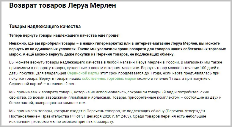К счастью, многие большие магазины устанавливают свои правила возврата, которые гораздо гуманнее тех, что прописаны в законе. К апримеру, в «Леруа Мерлен» можно возвращать почти всё, что угодно, в течение 100 дней, но это ещё не всё.