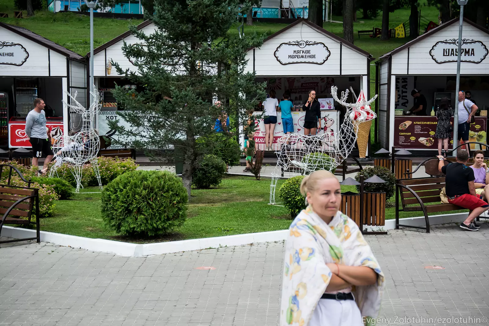 Если отъехать от центра всего этого дикого манжерокского рынка, где отдыхают не самые богатые россияне, в сторону озера Манжерок, то не сразу веришь своим глазам. Вдруг появляются какие-то красивые и опрятные одинаковые домики, которые на самом деле гостиницы со стоимостью по 15 тысяч за рублей за ночь в летний сезон, красивые прогулочные дорожки, полноценные, настоящие и реально хорошие бесплатные (!) туалеты, модные современные заведения и даже рынок все с теми же сомнительного качества дарами Алтая, но каждый продавец уже сидит в красивом домике (правда, они все одинаковые). Как принято говорить, «всё как в Европе».