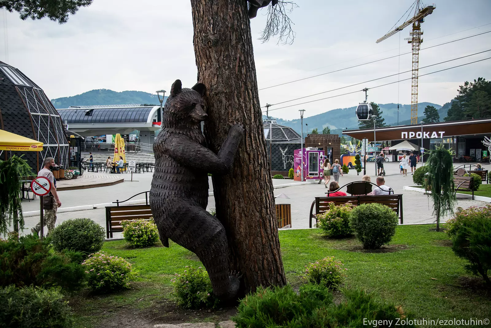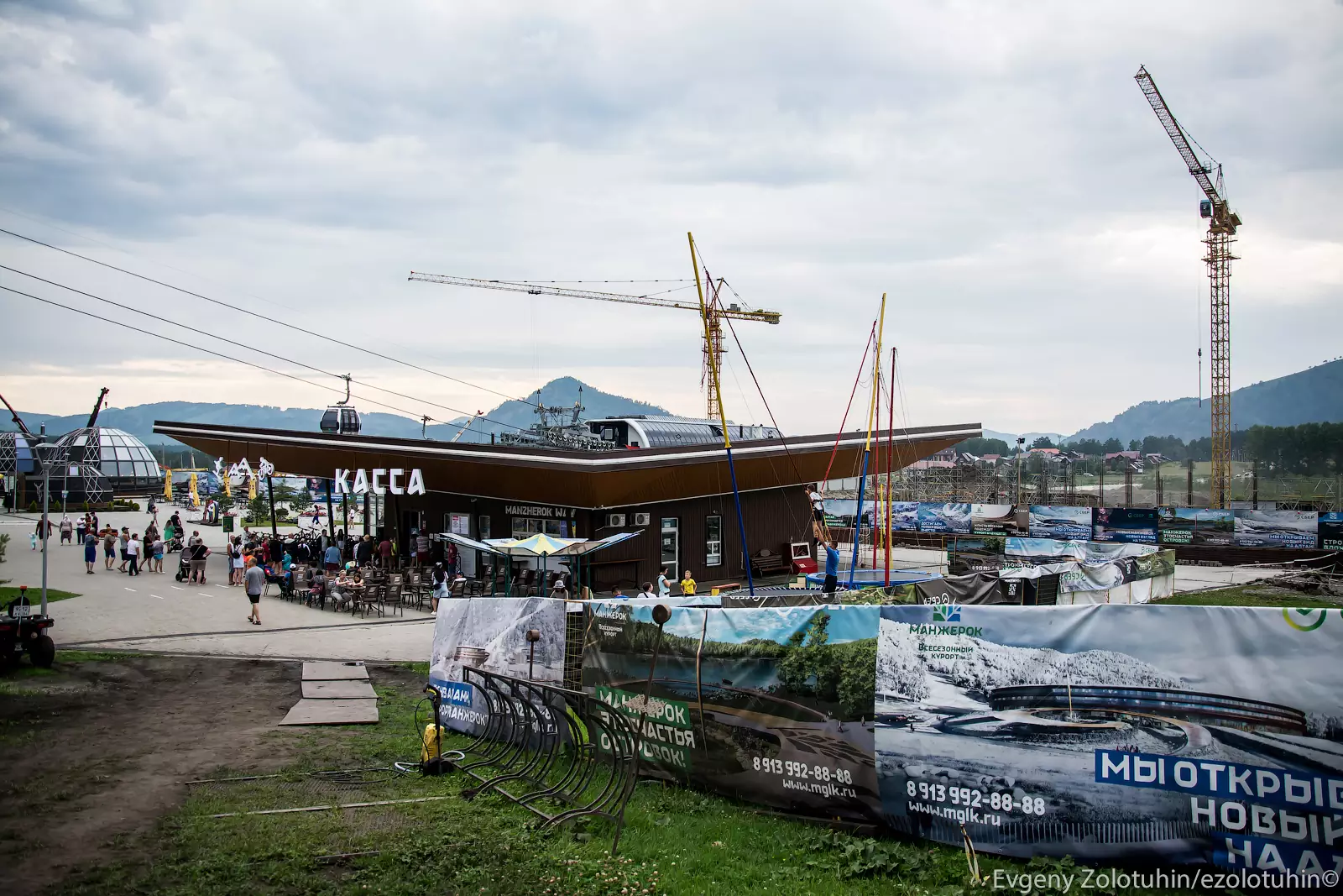 С баннеров, которыми завешены строительные площадки, банк обещает сделать из Манжерока курорт будущего, и всё в таком духе. Кроме того, курорт называют всесезонным, то есть жизнь здесь должна кипеть в любое время года. Для зимнего отдыха есть новенькая канатная дорога на вершину горы и горнолыжные спуски. Первым по новой канатке пару лет назад прокатился лично Герман Греф, оплатив проезд через Apple Pay.