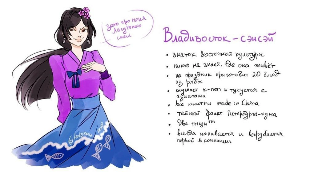 Также «Ридус» писал, как ещё одна российская художница нарисовала страны мира в человеческом облике. Персонажи получились воинственными и похожими на героев компьютерных игр, каждого из них она снабдила объяснением концепции образа.