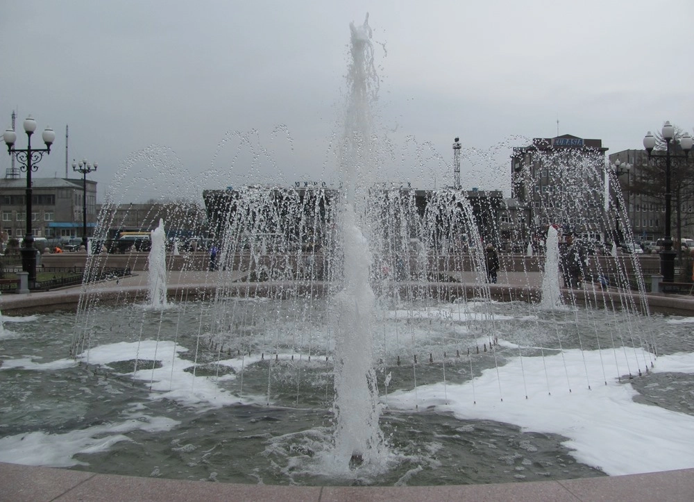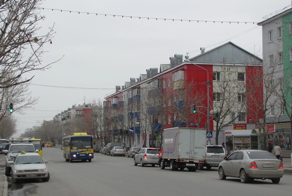Южно-Сахалинск сильно вытянут с севера на юг, и проспект Мира, главная улица города, словно ось, пронизывает его на всём протяжении. Выйдя там, где на взгляд кажется «поцентрее», понимаем, что угадали — по Коммунистическому проспекту, перпендикулярному проспекту Мира, направляемся к железнодорожному вокзалу.