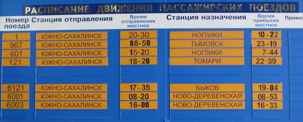 Сахалинская железная дорога, как известно, ещё с японских времен узкоколейная. Изучаем расписание — два поезда в северную часть Сахалина до Ногликов, один чуть ближе до Тымовска и один до Томари.