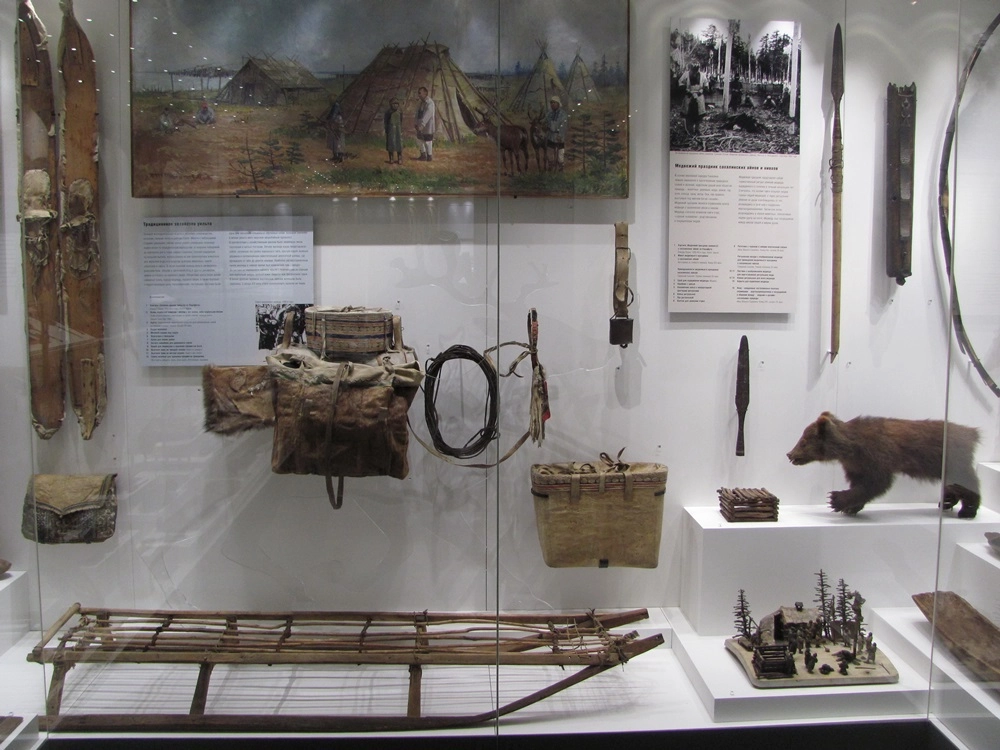А теперь — ознакомимся с экспозициями музея более подробно. Первые стенды рассказывают о жизни и быте коренных народностей, населявших Сахалин — айнов (на юге острова) и нивхов (на севере):