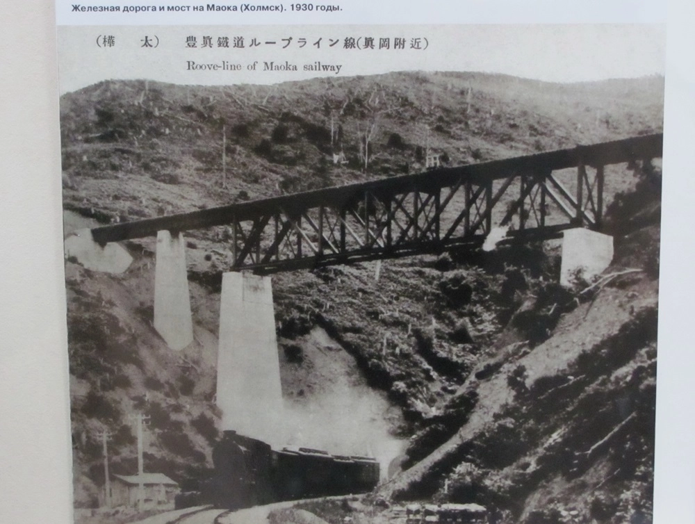 Стенды музея, рассказывающие о японском периоде истории Южного Сахалина. Железная дорога и мост на Маока (Холмск) в 1930 годы: