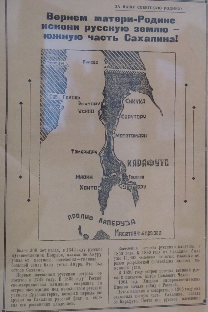 8 августа 1945 года СССР объявил войну милитаристской Японии — начались бои на Дальнем Востоке по освобождению Маньчжурии, Китая, Кореи, Южного Сахалина и Курильских островов. Наступательная операция по освобождению Южного Сахалина началась 11 августа — в течение недели советские воины, неся значительные потери, отчаянно дрались на подступах к опорным пунктам в Котонском укрепрайоне. Одновременно подразделения Северной Тихоокеанской флотилии и 16 армии высадили военный десант на западное побережье острова. 15 августа был взят административный центр Карафуто — город Тойохара (Южно-Сахалинск). Бои за освобождение Курильских островов вели части Камчатского оборонительного района. Несмотря на трехкратное превышение сил противника, к исходу 23 августа 12 тысяч японских солдат и офицеров на острове Шумшу сложили оружие. 24 августа был разоружен гарнизон в Парамушире, затем заняты и остальные Курильские острова. Капитуляция Японии произошла 2 сентября 1945 года на борту американского линкора «Миссури». Вторая мировая война закончилась.