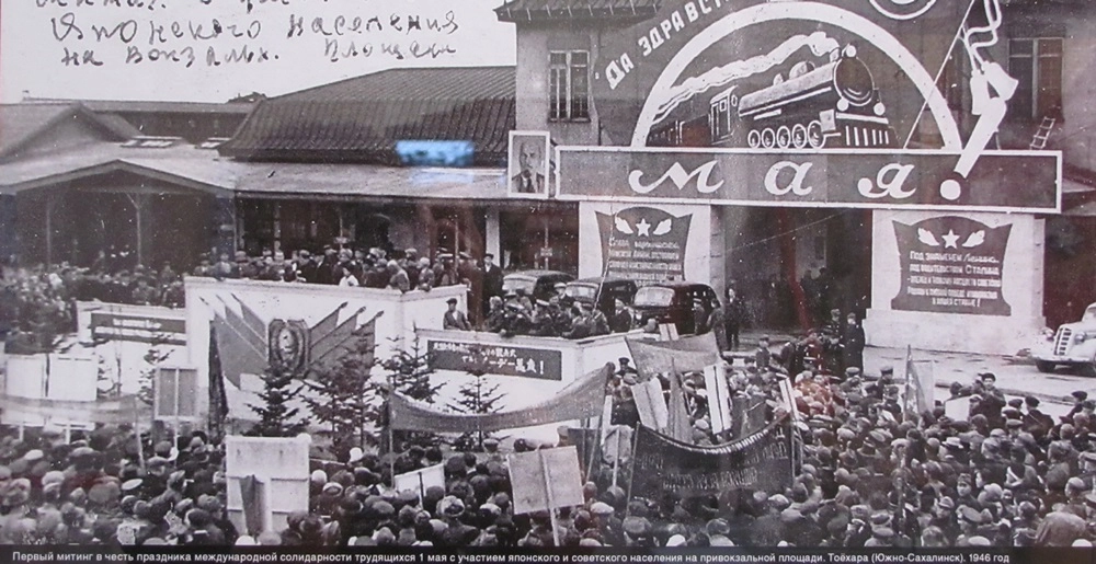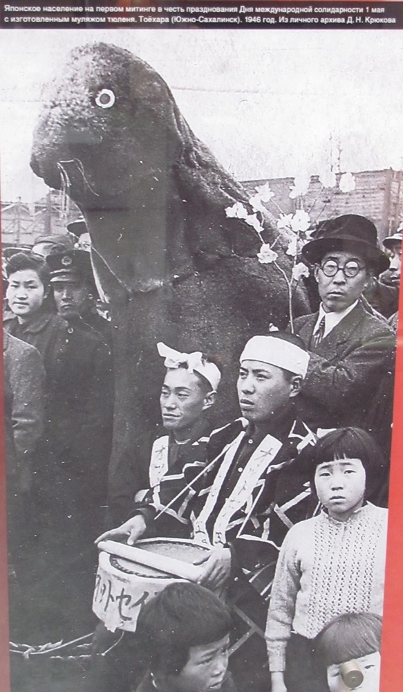 Японское население Южно-Сахалинска на митинге 1 мая 1946 года с муляжом тюленя. Лица не очень веселые…