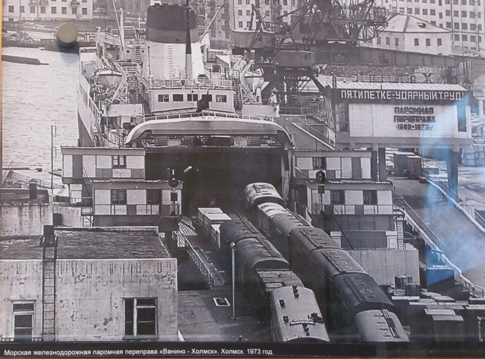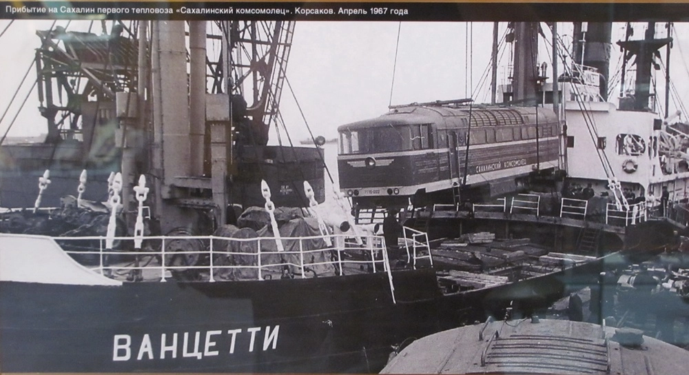 В заключение мы посмотрели стенды, рассказывающие о послевоенном периоде Сахалинской области и нынешнем дне острова. Прибытие на Сахалин первого тепловоза «Советский комсомолец»: