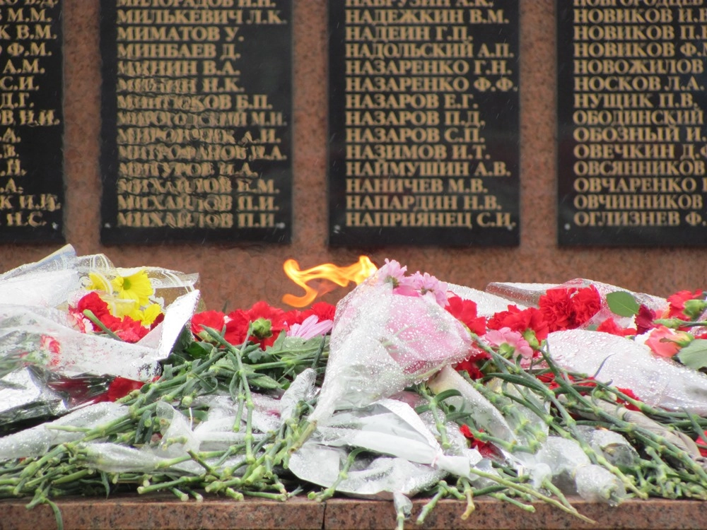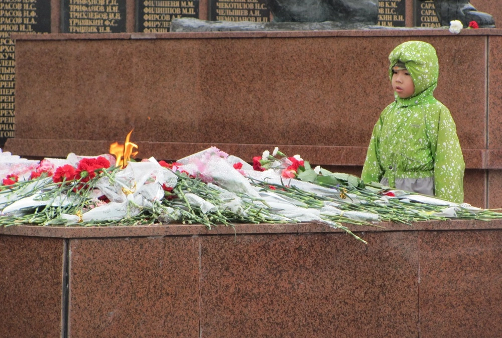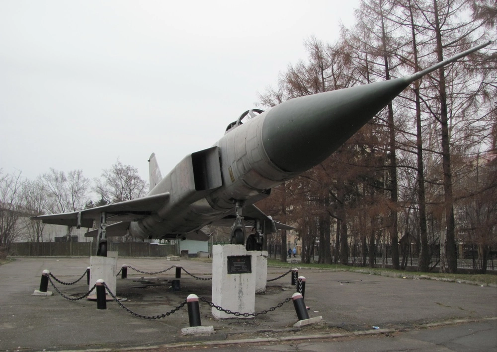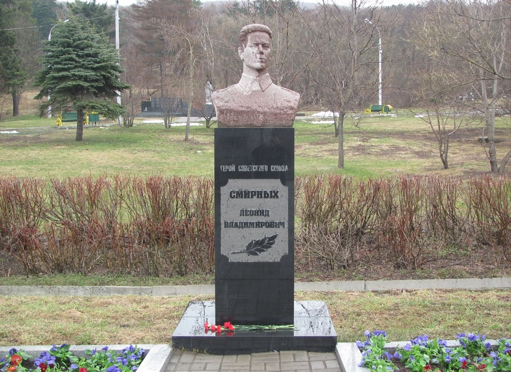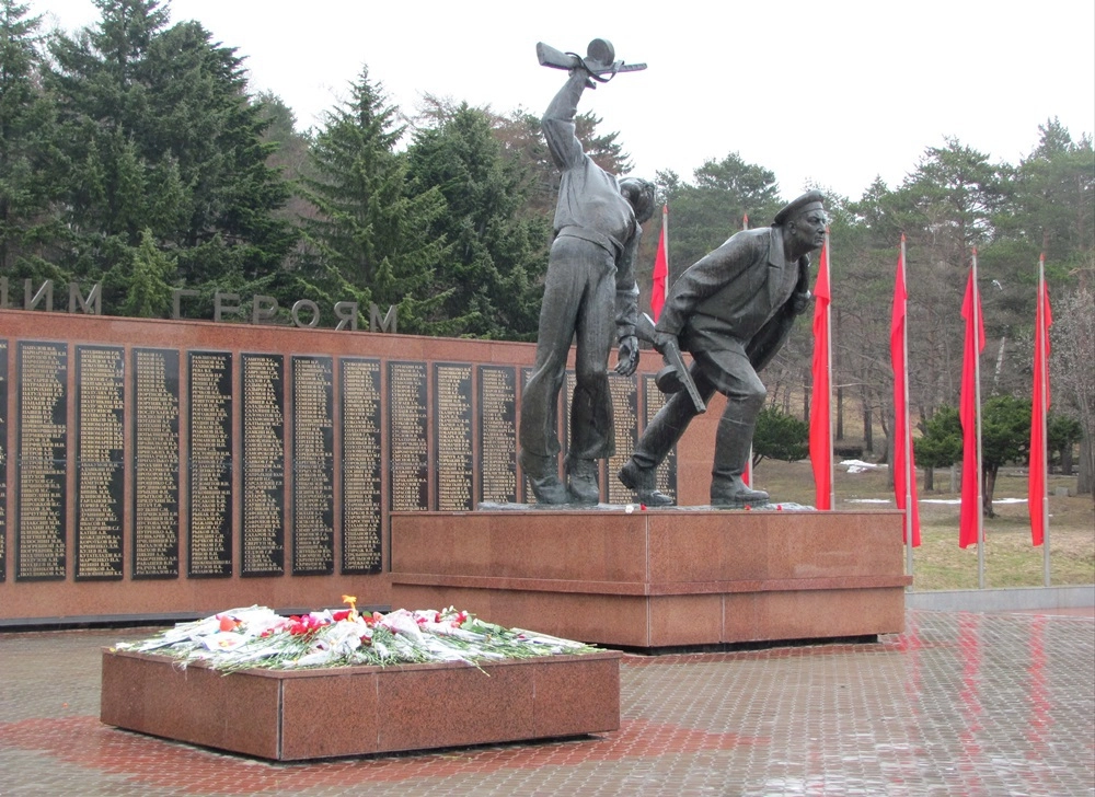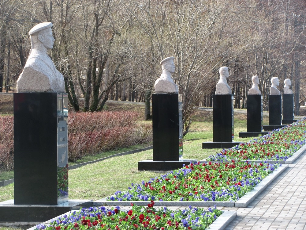 От краеведческого музея совсем недалеко до Площади Славы, где горит Вечный огонь и находится монумент советским воинам, павшим за освобождение Южного Сахалина и Курильских островов. По дороге проходим мимо Дома Офицеров, во дворе которого обнаружился Су-15 и другая военная техника: