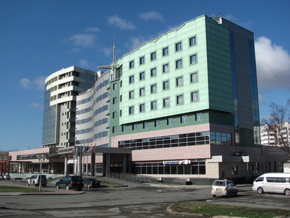 А теперь осталось только разобраться с гостиницей — ага, «Пасифик Плаза» на проспекте Мира. На вид классный отель — подойдёт! Таким образом, программа поездки постепенно прояснялась — сегодня знакомимся с Южно-Сахалинском, завтра — Корсаков, послезавтра — Холмск и западное побережье острова, плюс в один из ясных дней (если таковые конечно будут) — хорошо бы забраться вон на ту возвышающуюся над городом здоровенную сопку! Ну, а первым делом — в краеведческий музей, который нахваливали все бывавшие на Сахалине знакомые.