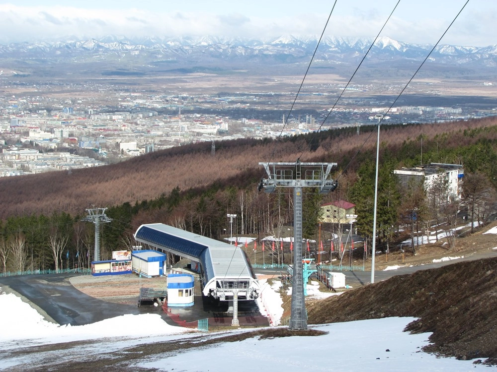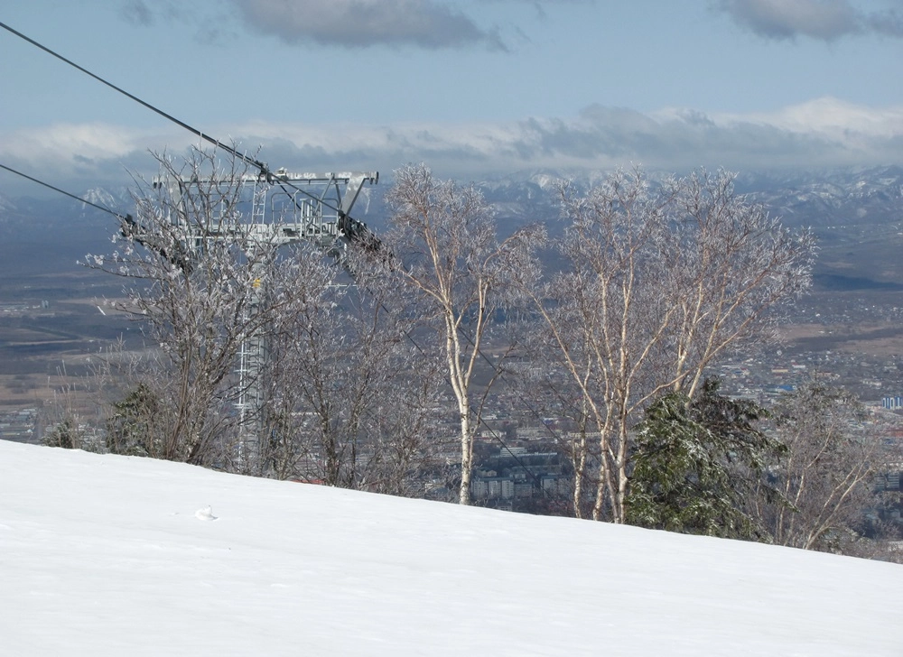 От мемориального комплекса начинается дорога вверх на сопку, к горнолыжной базе «Горный воздух». Извиваясь словно гигантская змея, дорога все выше и выше поднимается по склонам сопки. Чем выше, тем больше снега вокруг — сначала только в прогалинах, потом всё больше и больше у обочины дороги. Вскоре оказываемся у ворот горнолыжной базы, расположенной примерно на середине горы. Отсюда уже очень красиво, но дальше дороги нет — только крутой склон, покрытый снегом.