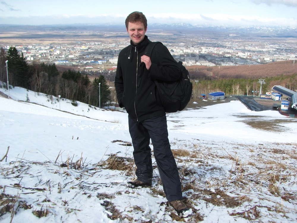 Согласно прогнозу Гидрометцентра, на другой день должно было распогодиться — и действительно, с самого утра на улице светило столь долгожданное солнышко. Что же — значит судьба всё-таки нам увидеть Сахалин при солнечном свете! Воспользовавшись погожим деньком, мы в первую очередь решили взобраться на сопку Большевик, вершина которой возвышается прямо над самым центром Южно-Сахалинска.