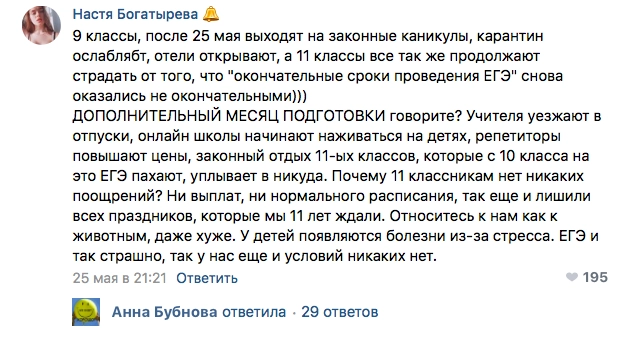Родителей и самих выпускников возмутила задержка оглашения сроков проведения ЕГЭ. День публикации точных дат несколько раз переносили, что нагнетало и без того напряженную ситуацию.