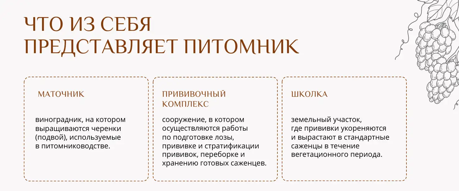 - выращивания будущей корневой системы в виде черенков филлоксероустойчивых подвоев на собственных маточниках. Питомник-маточник — это виноградник, на котором выращиваются черенки (подвой), используемые для изготовления посадочного материала;