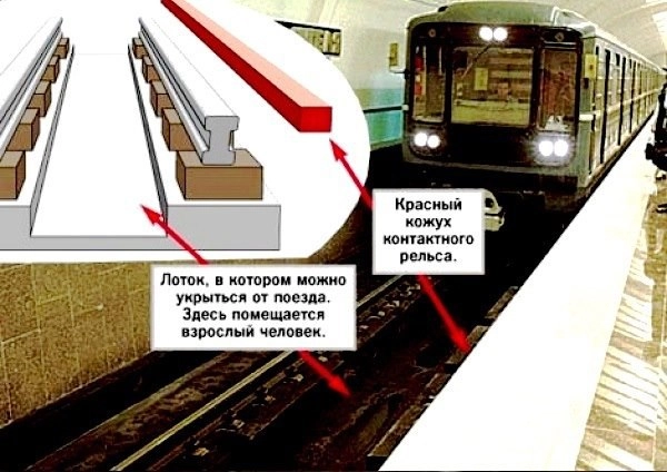 2. Если вдруг не можешь бежать или некогда убегать. Ложись лицом вниз в выемку между рельсами, головой к поезду. Крайне важно успеть скинуть с себя рюкзаки и сумки.