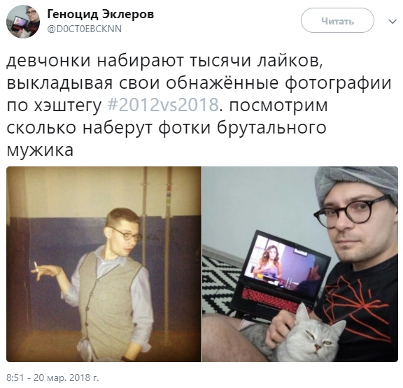 Флешмобы из серии «посмотрите, как я выглядел 5, 7, 10 лет назад» уже не новинка для активных пользователей социальных сетей. На этот раз новый флешмоб, запущенный в соцсети Reddit, называется #2012vs2018. Пользователи сравнивают себя на последних фотографиях с изображениями шестилетней давности, тем самым показывая, какие изменения произошли с ними за последние годы. Некоторые выкладывают не только себя, но и своих питомцев, знаменитостей и многое другое.