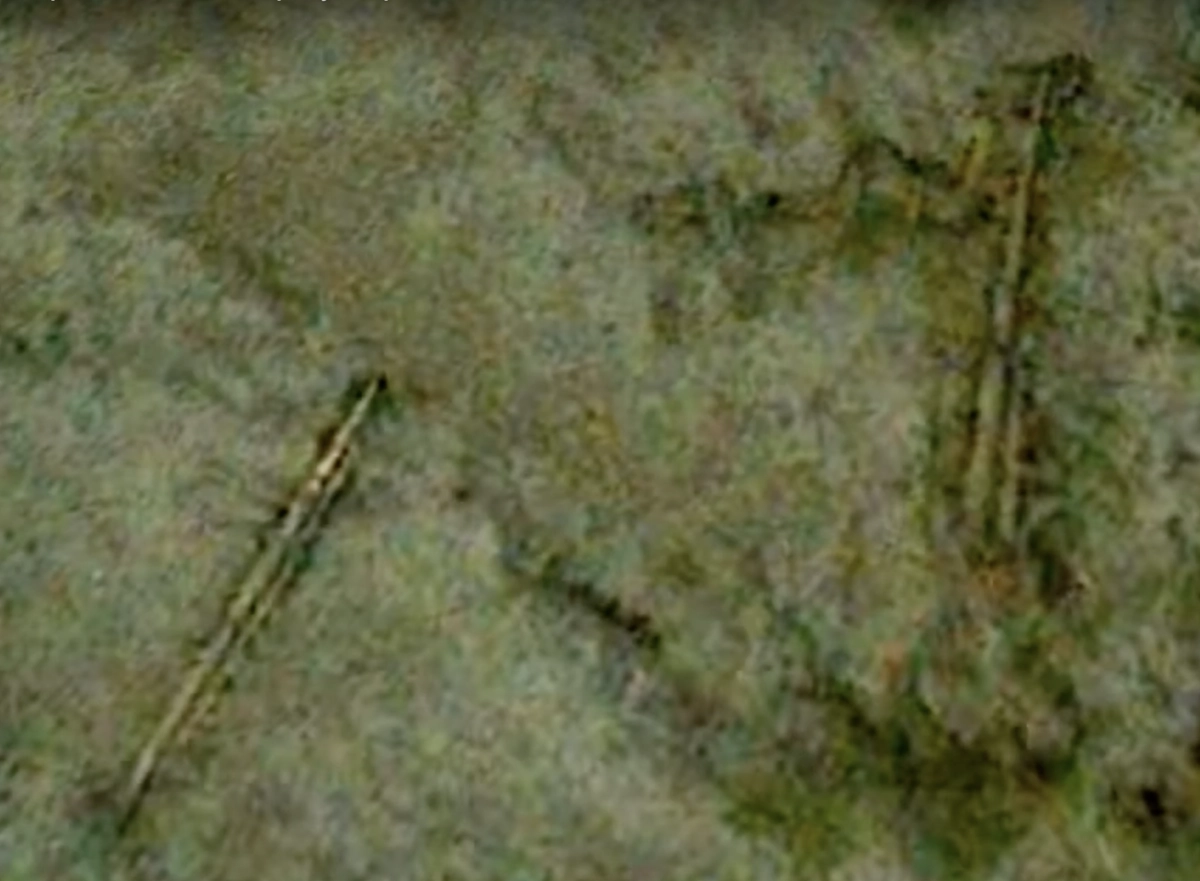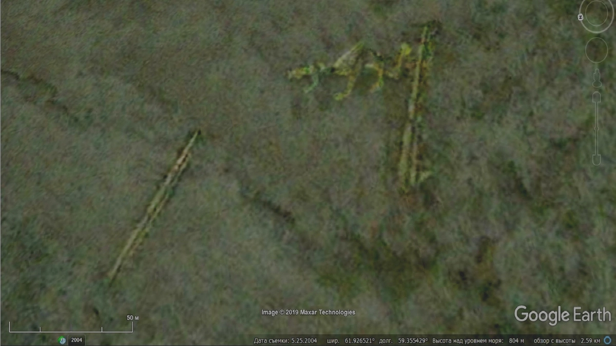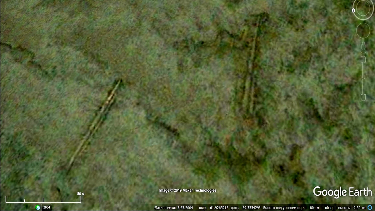 Координаты находки такие: 61.927655°, 59.356093°. Теперь скажу пару слов о самом изображение. Камнями выложены две прямые фигуры, которые символизируют деревья. Две сосны или кедра, каждая длиной до 100 метров. Рядом с ними какое-то чудовище. Тоже очень больших размеров. Этот рисунок сохранился немного хуже, чем другие. Но контуры изображения, его детали видны неплохо. Рисунок так же длиной около 100 метров.