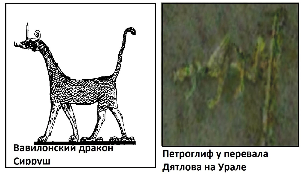 В 20 километрах на север в направление от перевала Дятлова, находится довольно высокая гора. На её вершине имеется петроглиф очень большого (порядка 100 метров) размера. Древний рисунок выложен из камней. Видимо видно его только с высоты, если его так и не нашли.