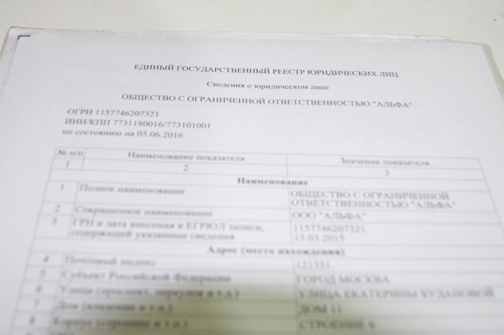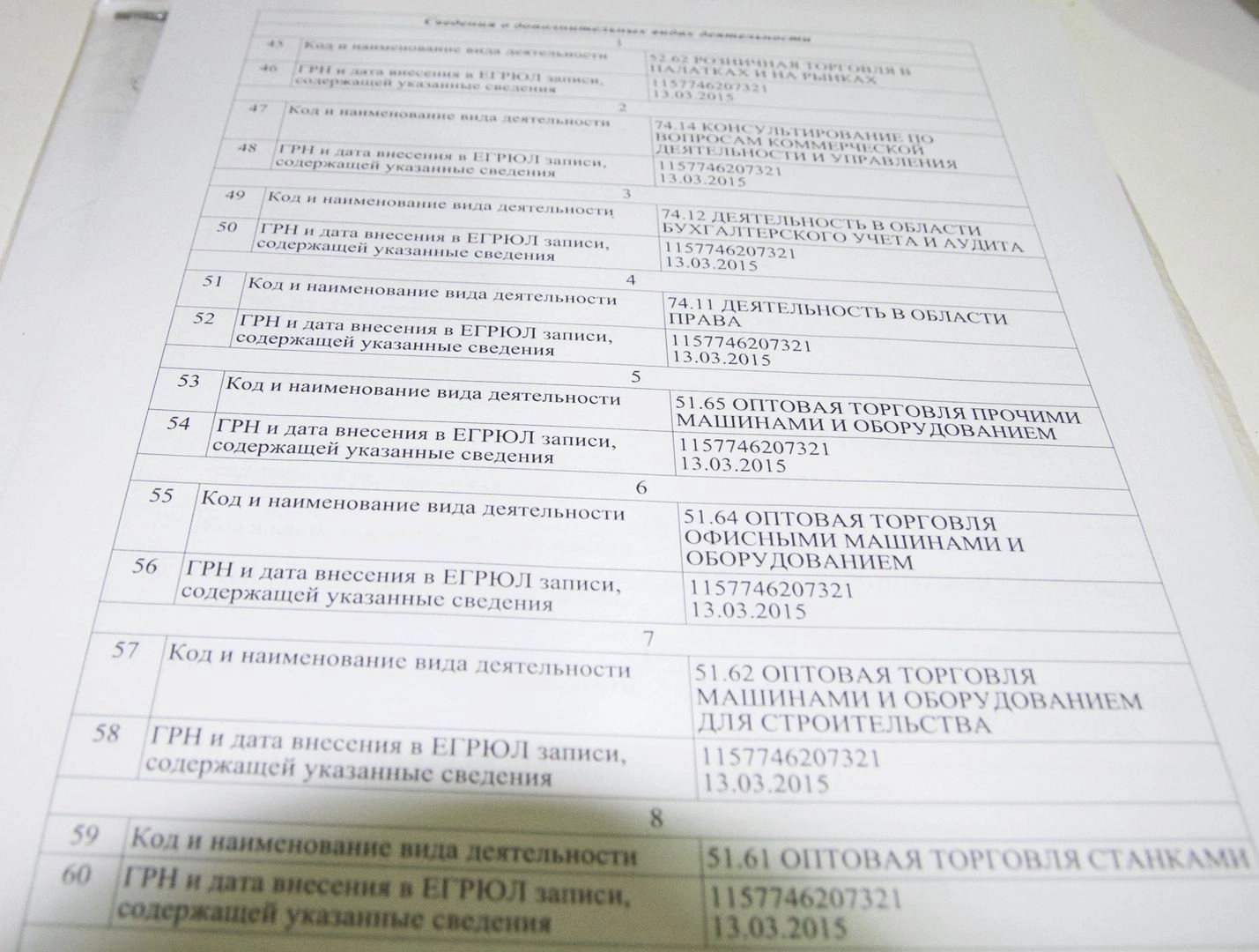 Интересную информацию об ООО «Альфа» выдал Единый государственный реестр юридических лиц — оказалось, что консультации — лишь 1 из 29 видов деятельности фирмы. Помимо «помощи обманутым гражданам» общество с ограниченной ответственностью занимается палаточной торговлей, грузоперевозками, бухучетом и продажей офисной техники.